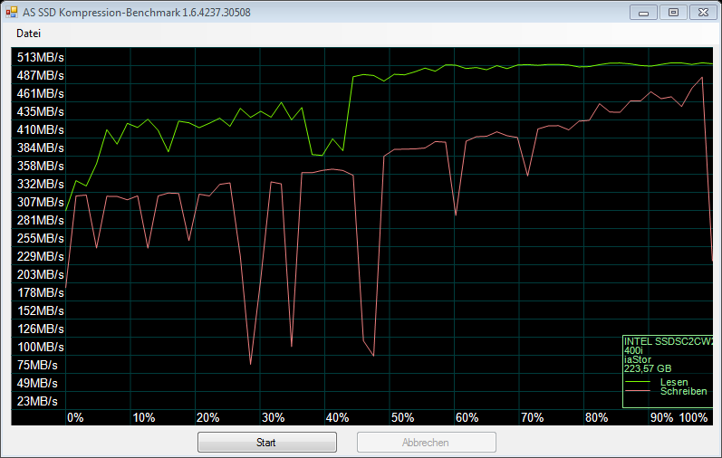 Wyróżniającą cechą kontrolera SandForce jest automatyczna kompresja danych. Im lepiej są one skompresowane, tym szybszy jest dysk. Dobrze pokazuje to test aplikacji AS SSD. Intel 510 (z kontrolerem Marvell) osiągnął w nim podobne wartości, co nowszy model 520. W przypadku tego ostatniego zapis wynosił od 300 MB/s (dane nieskompresowane) do 485 MB/s (dane optymalnie skompresowane). Według producenta większość danych daje się kompresować powyżej 60%; oznaczałoby to, że zapis powinien osiągać około 400 MB/s i więcej.