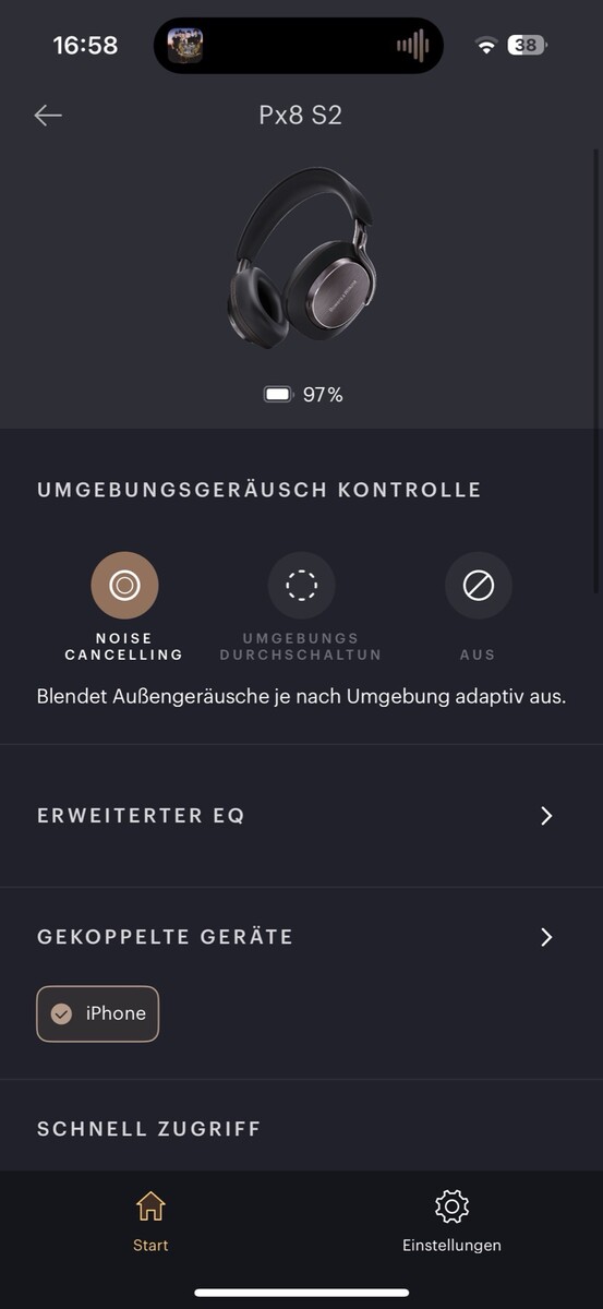 Szkoda, że przycisk do przełączania pomiędzy trybem ANC i przezroczystości nie zapewnia wyraźnej informacji zwrotnej - B&W odtwarza różne dźwięki, aby pokazać użytkownikom, który tryb został wybrany. Dźwięki te nie są jednak zrozumiałe i trzeba je zapamiętać. Z drugiej strony, dźwięk jest po prostu niesłyszalny podczas odtwarzania muzyki. Chociaż słuchawki na krótko ściszają muzykę po naciśnięciu przycisku, dźwięk jest odtwarzany wcześniej i dlatego nie jest słyszalny przy wyższych poziomach głośności