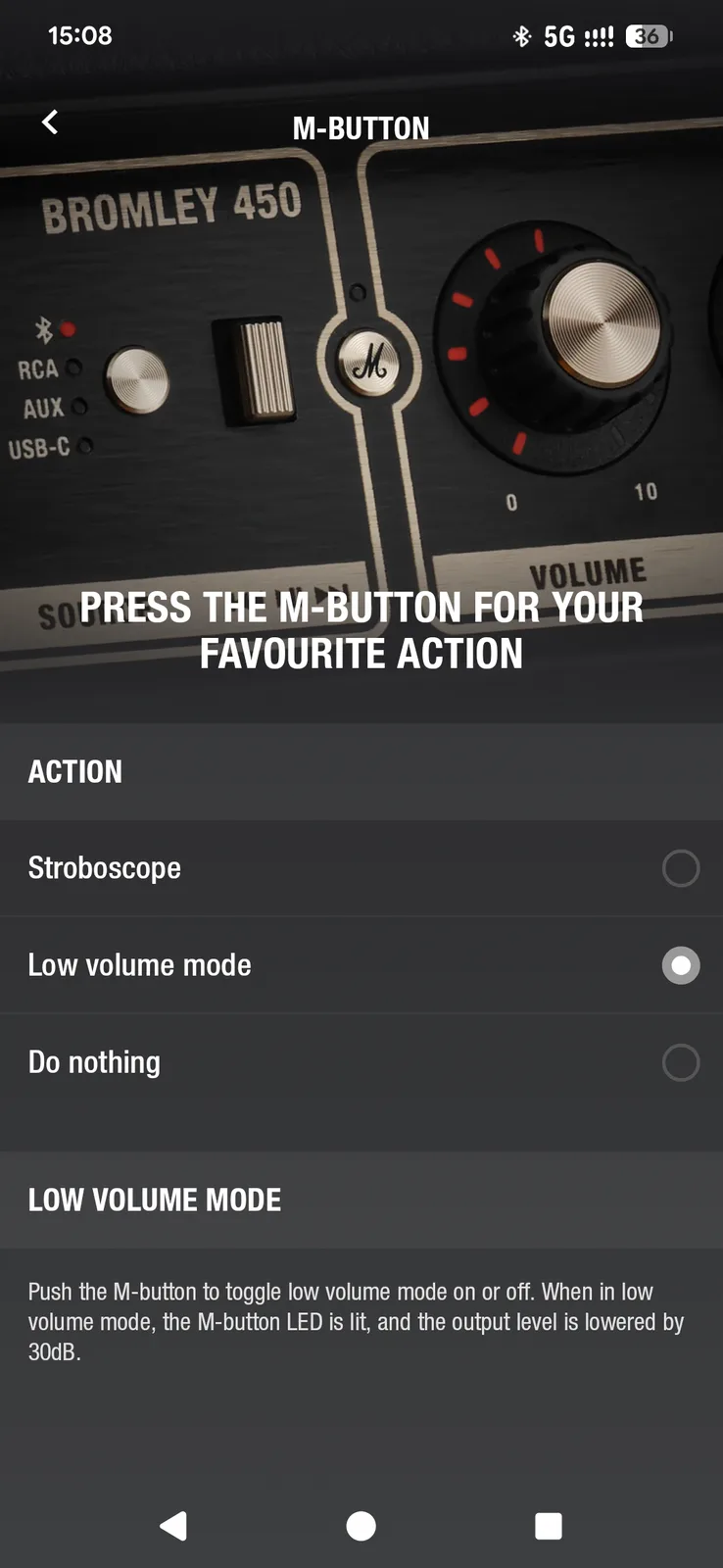 W przypadku cichszych ustawień - takich jak balkon lub bardziej zrelaksowane otoczenie - dostępny jest tryb niskiego poziomu głośności, który zmniejsza moc wyjściową o 30 dB. W razie potrzeby można przypisać tę funkcję do przycisku M.