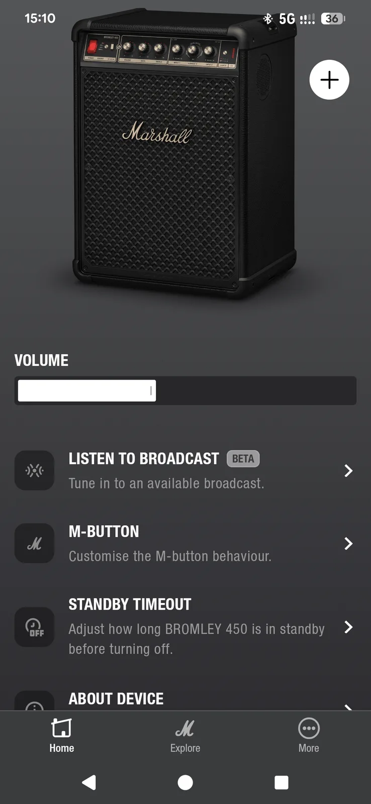 Bromley korzysta z tej samej aplikacji, co słuchawki Marshalla. Aplikacja Marshall Bluetooth wygląda schludnie i jest łatwa w nawigacji, ale brakuje jej funkcji. Będzie ona potrzebna głównie do Auracast (łączenia wielu kompatybilnych głośników) i konfigurowania przycisku M, który obecnie obsługuje tylko jedną z dwóch przypisywanych funkcji. Poza regulacją głośności, nie ma zbyt wielu funkcji, które można regulować zdalnie - brak korektora, brak regulacji tonów wysokich i niskich.