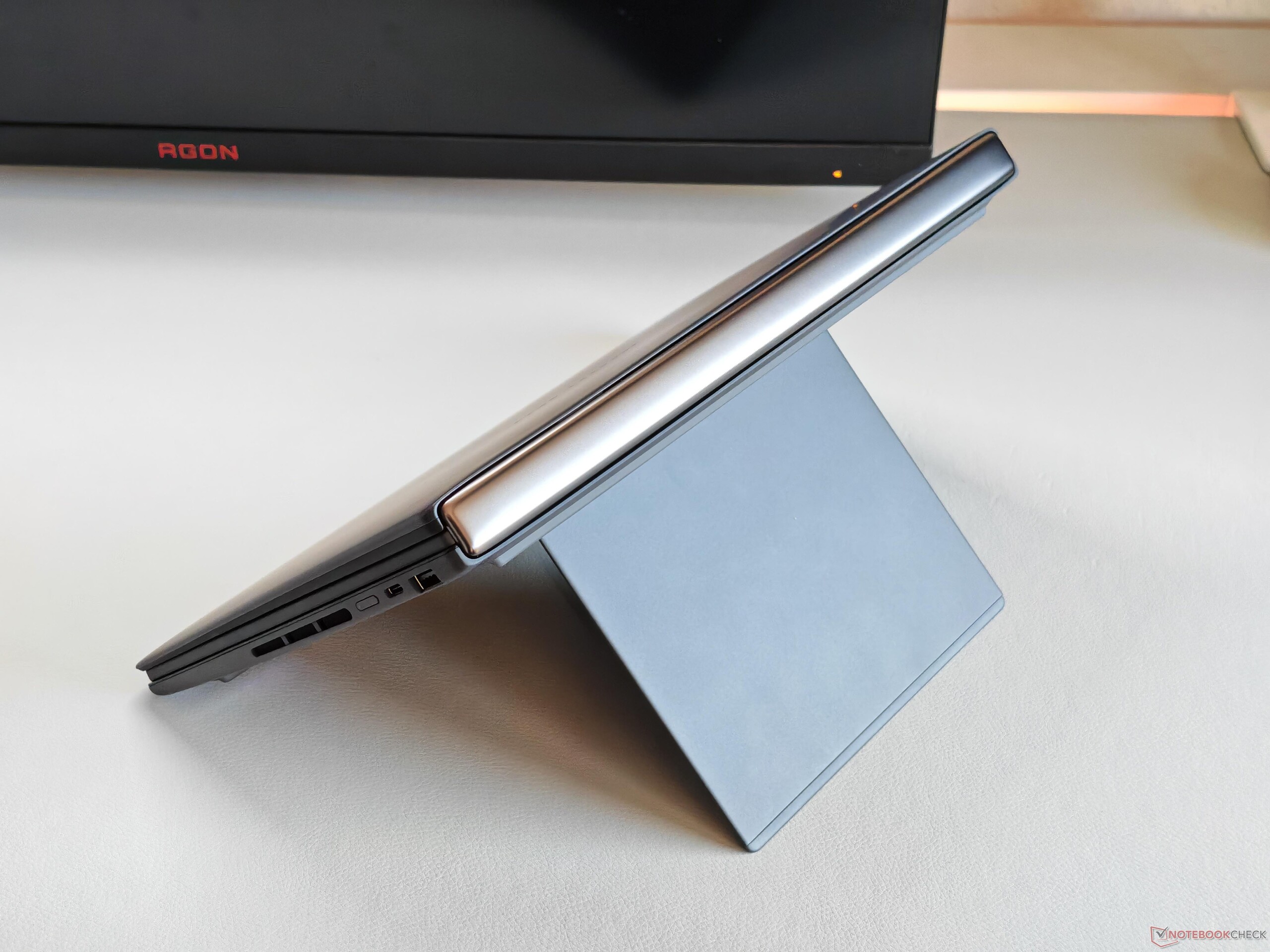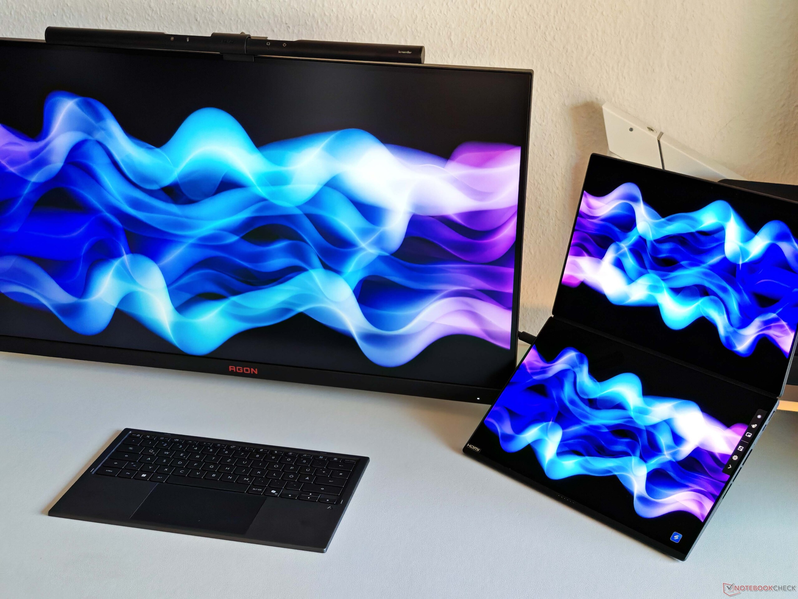 Asus znacznie przeprojektował swój ZenBook Duo z UX4807, eliminując kilka słabości starszych modeli. Zaczyna się to od nowej konstrukcji zawiasów, dzięki której oba ekrany są bliżej siebie. Korzystanie z urządzenia otwartego jak książka jest teraz znacznie wygodniejsze. Chociaż nowy model jest nieco grubszy, jest lżejszy w ramach swego rodzaju rekompensaty. Proszę tylko upewnić się, że oba ekrany są rzeczywiście przydatne, ponieważ w przeciwnym razie zakup tak (stosunkowo) grubego systemu nie ma większego sensu.