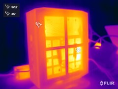 Na obudowie NAD9 znajduje się wiele otworów służących do wciągania świeżego powietrza i wypychania ciepłego z obudowy. Ponadto urządzenie posiada stosunkowo duży cooler z trzema ciepłowodami, który ma za zadanie utrzymaćIntel Core i9-12900Hładnie i chłodno w określonych granicach mocy. W teście wielopętlowym Cinebench R15 widzieliśmy już, że SoC nie był w stanie utrzymać swojej maksymalnej częstotliwości turbo przez bardzo długi czas, przez co pobór mocy spadł do zaledwie 45 W. Co więcej, BIOS ogranicza maksymalną temperaturę SoC do 87°C (188,6°F) zaraz po wyjęciu z pudełka. To z kolei oznacza, że po osiągnięciu tej wartości progowej rozpoczyna się dławienie termiczne. Podczas naszych testów komputer ciągle przekraczał tę granicę temperatury. Podczas testu obciążeniowego z użyciem FurMarka zauważyliśmy, że temperatura osiągnęła 90°C (194°F).