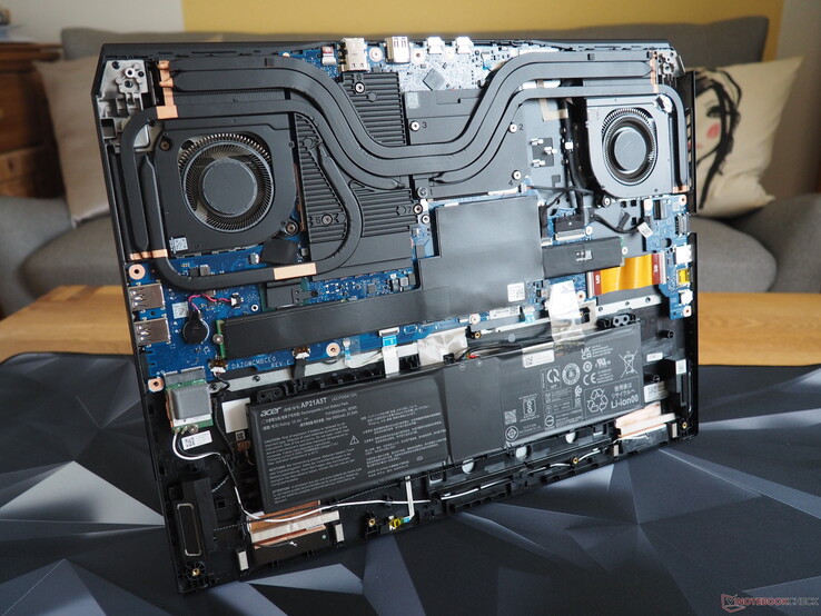 Jego opcje konserwacji pozostawiły nas z mieszanymi uczuciami. Odkręcenie 14 śrub Torx i podważenie dolnej płyty zajmuje sporo czasu, a dodatkowo Acer może nawet odstraszyć wielu użytkowników poprzez zastosowanie plomby gwarancyjnej (zakrywającej jedną śrubę). Wewnątrz mamy przynajmniej dostęp do układu chłodzenia, baterii, modułu WLAN, pamięci RAM i dysku SSD. Te dwa ostatnie są jednak przykryte foliami i podkładkami, co nie ułatwia ich wymiany.