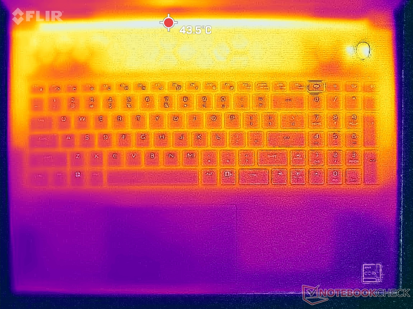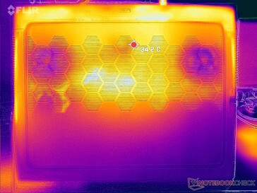 Średnie temperatury powierzchni są ogólnie niższe niż to, co zaobserwowaliśmy na Asus ROG Strix G18. Gorące punkty są przesunięte w kierunku tylnej części obudowy, aby zminimalizować kontakt ze skórą.