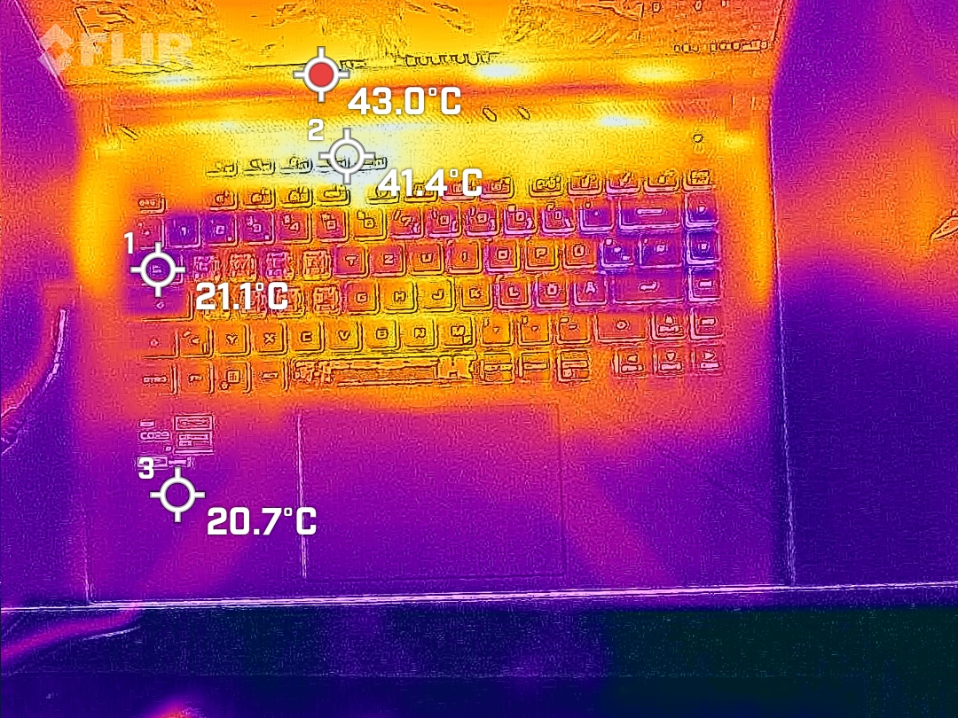Potężny sprzęt dość mocno nagrzewa obudowę ROG Strix G16. Podczas gry temperatury na górze notebooka wzrastają do nawet 54°C. Na szczęście wentylatory gamingowego notebooka znajdują się bezpośrednio pod klawiszami WASD. W tym miejscu temperatura zauważalnie spada, dzięki czemu nie poparzysz sobie palców podczas gry. Podpórki pod dłonie zawsze pozostają chłodne. Podczas gry należy postawić notebooka na solidnej powierzchni.