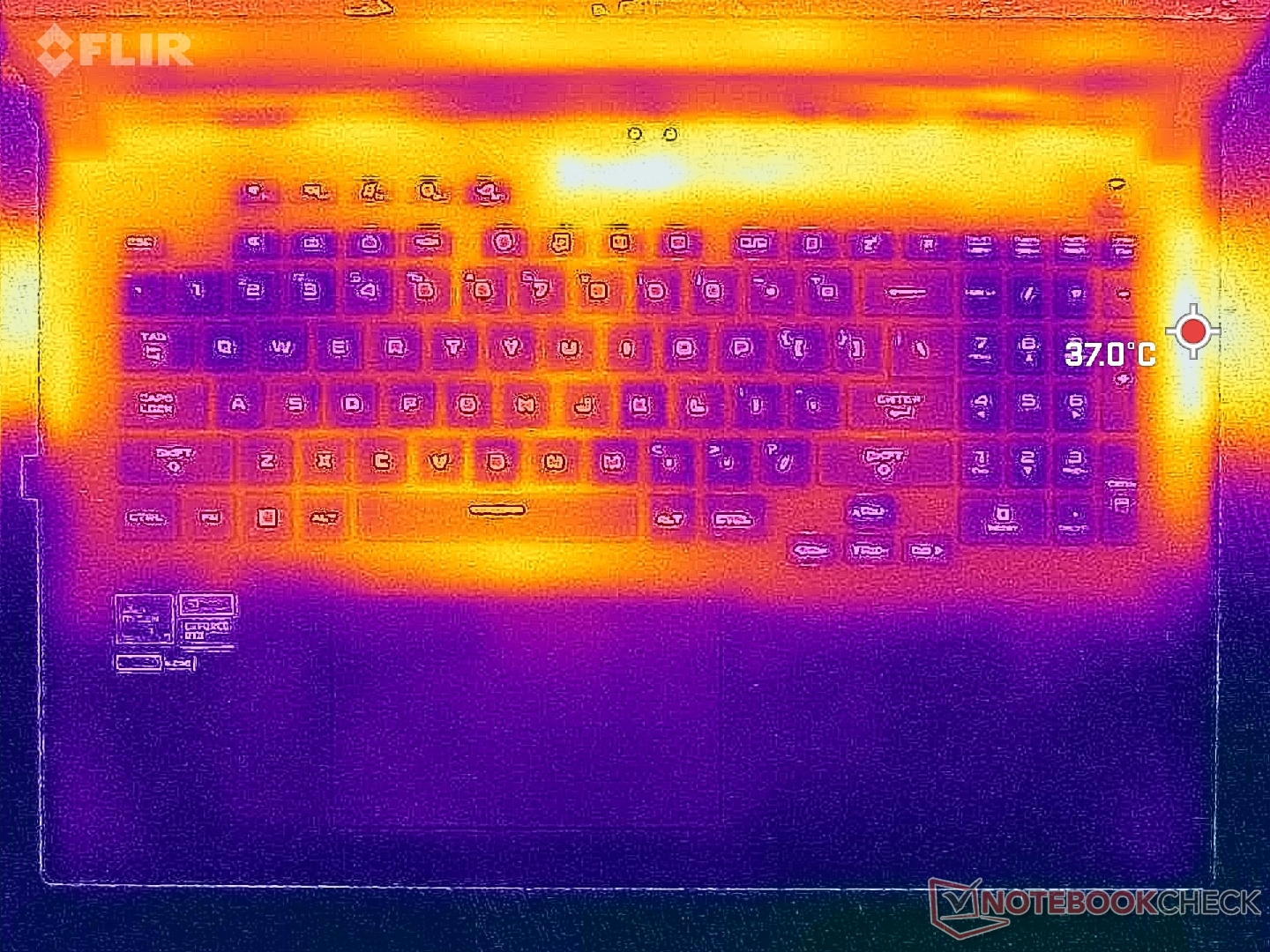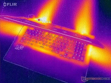 Znaczna część klawiatury i podpórki pod dłonie pozostaje chłodna podczas gry. Gorące punkty znajdują się natomiast wzdłuż krawędzi pulpitu, gdzie palce rzadziej się dotykają.