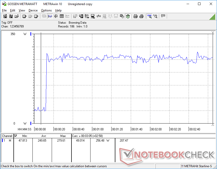 Jesteśmy w stanie zarejestrować maksymalny pobór 280 W z dużego (~18,4 x 8,4 x 3,6 cm) zasilacza AC 330 W.