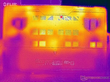 Temperatury powierzchniowe są niższe niż w większości innych laptopów do gier, głównie ze względu na plastikowe materiały podstawy i liczne kratki wentylacyjne. Na przykład, średnia temperatura powierzchni naszego Asusa podczas grania osiągnęła zaledwie 29 C w porównaniu do 39 C w przypadku Razer Blade 17 który jest stosunkowo cieńszy, ma mniej kratek wentylacyjnych i jest wykonany głównie ze stopu metalu. Gorące punkty na naszym Asusie znajdują się również dalej w kierunku tyłu, gdzie palce są mniej podatne na dotyk.
