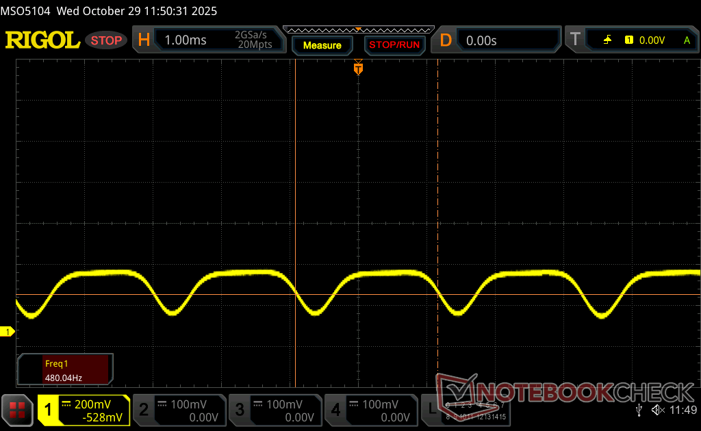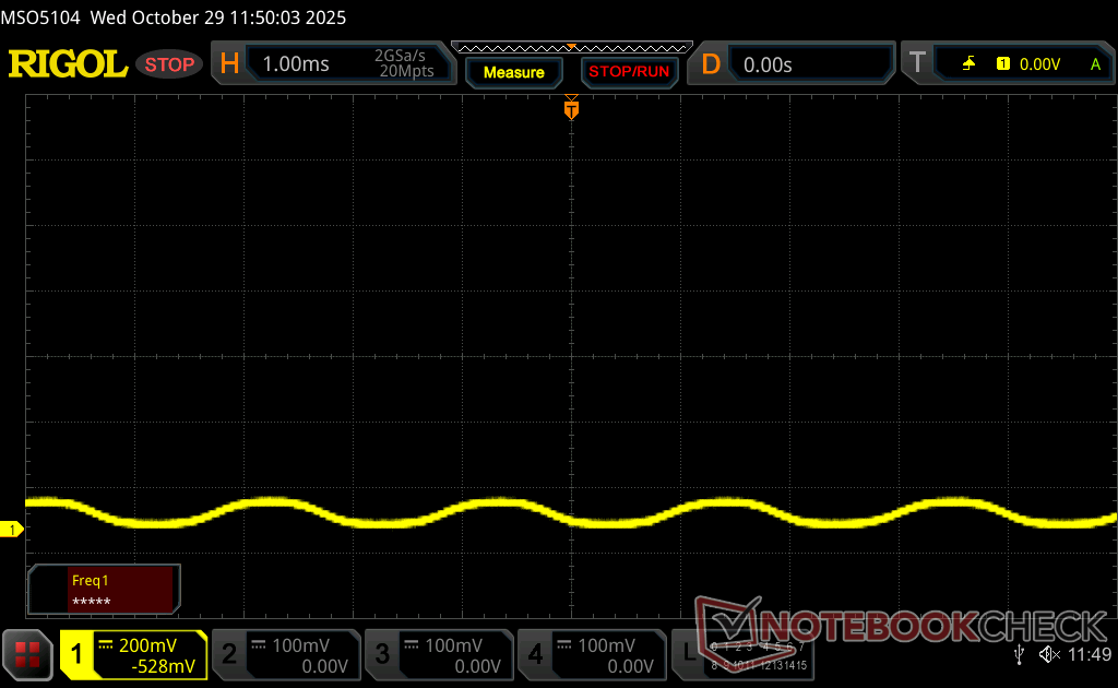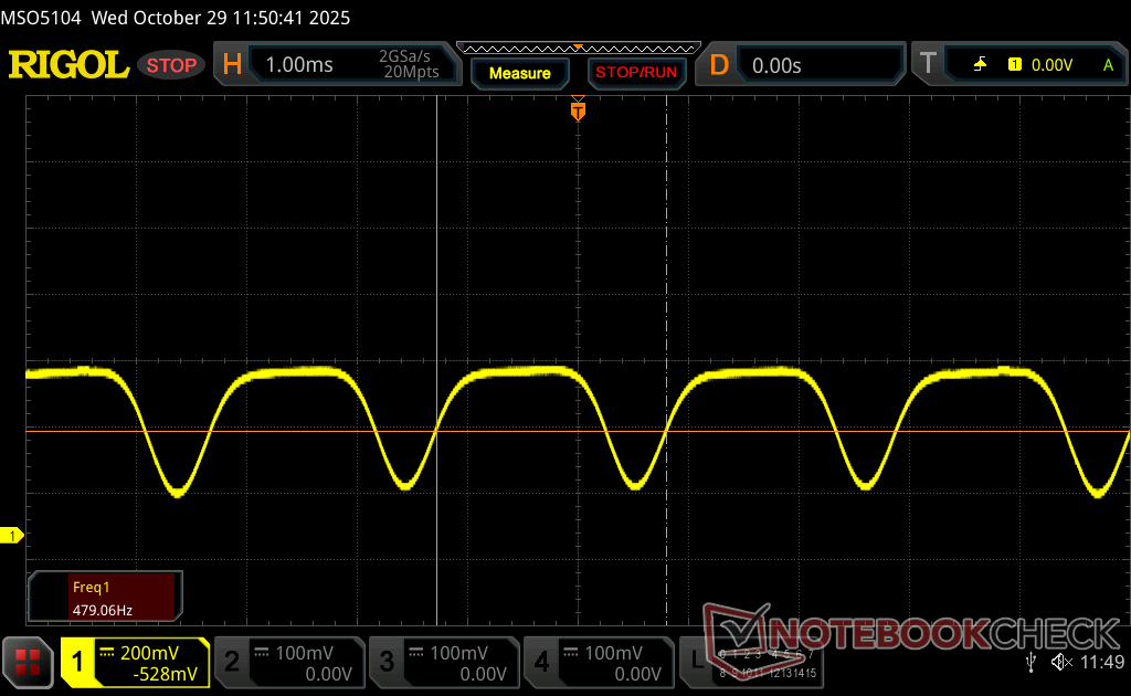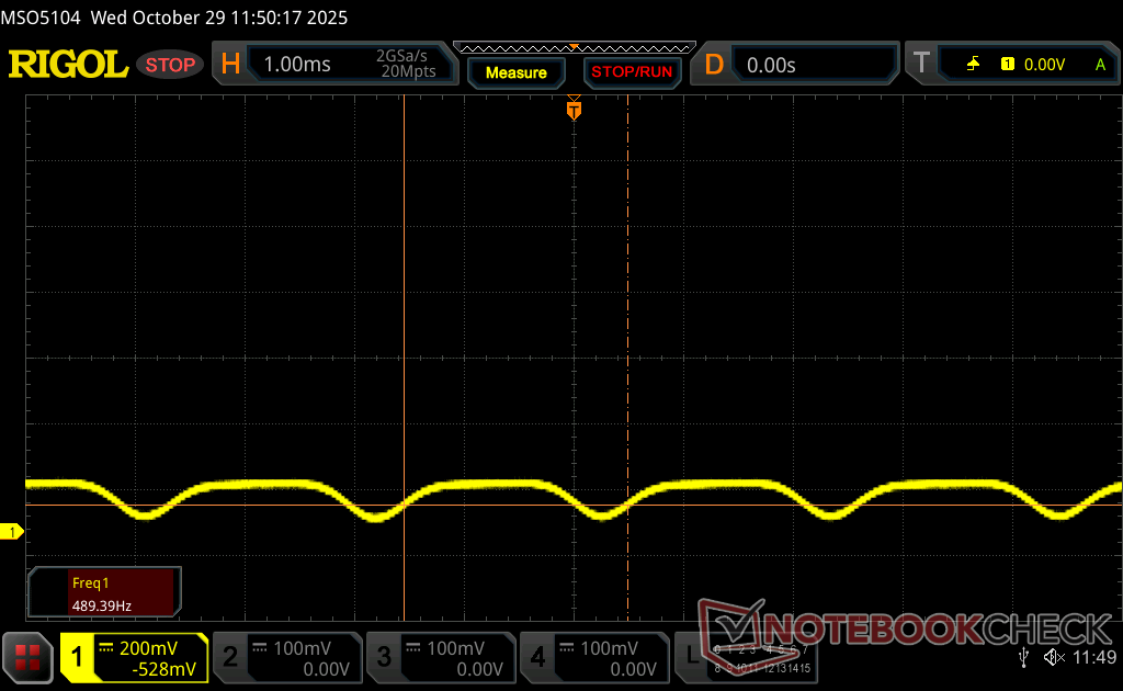 Podświetlenie wyświetlacza miga z częstotliwością 490.8 Hz (najgorszy przypadek, np. przy użyciu PWM) Wykryto migotanie przy ustawieniu jasności 100 % i poniżej. Powyżej tego ustawienia jasności nie powinno być żadnego migotania ani PWM. Częstotliwość 490.8 Hz jest stosunkowo wysoka, więc większość użytkowników wrażliwych na PWM nie powinna zauważyć żadnego migotania. Istnieją jednak doniesienia, że niektórzy użytkownicy są nadal wrażliwi na PWM przy częstotliwości 500 Hz i wyższej, więc należy zachować ostrożność. Dla porównania: 53 % wszystkich testowanych urządzeń nie używa PWM do przyciemniania wyświetlacza. Jeśli wykryto PWM, zmierzono średnio 8156 (minimum: 5 - maksimum: 343500) Hz. | |||