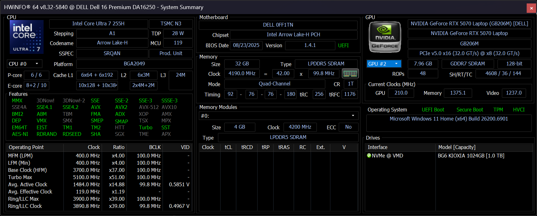 | Dell 16 Premium DA16250 Ultra 7 255H, GeForce RTX 5070 Laptop, Kioxia BG6 KBG6AZNV1T02, OLED, 3840x2400, 16.3" | Dell XPS 16 9640 Ultra 7 155H, GeForce RTX 4070 Laptop GPU, Kioxia XG8 KXG80ZNV1T02, OLED, 3840x2400, 16.3" | HP Spectre x360 16 RTX 4050 Ultra 7 155H, GeForce RTX 4050 Laptop GPU, SK hynix PC801 HFS001TEJ9X101N, OLED, 2880x1800, 16" | Lenovo Yoga Pro 9i 16 RTX 5070 Ultra 9 285H, GeForce RTX 5070 Laptop, WD PC SN7100S SDFPMSL-1T00-1101, OLED, 3200x2000, 16" | Asus Zenbook S 16 UM5606-RK333W Ryzen AI 9 HX 370, Radeon 890M, Micron 2400 MTFDKBA1T0QFM, OLED, 2880x1800, 16" | LG Gram Pro 16Z90TS-G.AU89G Core Ultra 7 256V, Arc 140V, Samsung PM9A1a MZVL21T0HDLU, IPS, 2560x1600, 16" | |