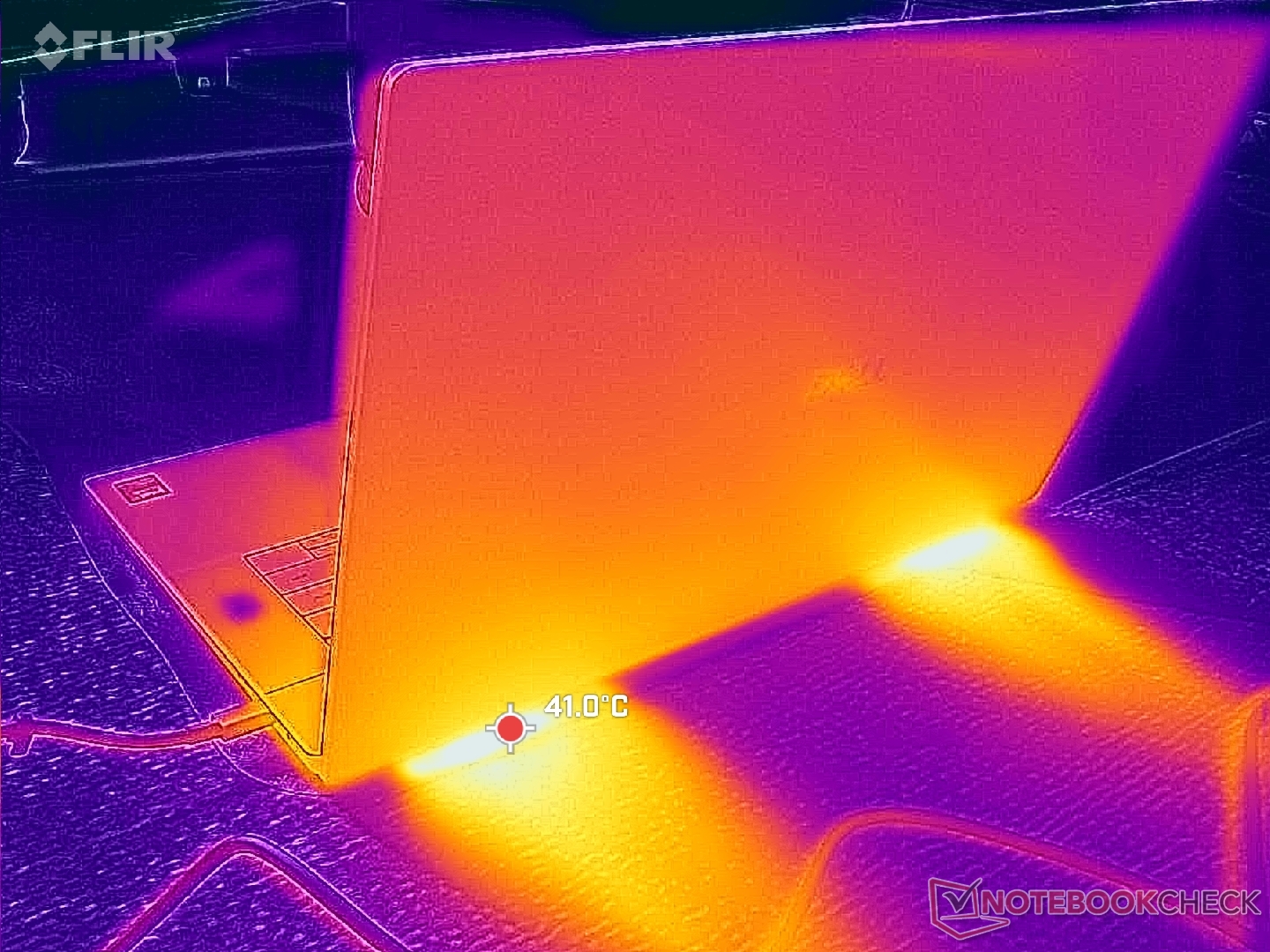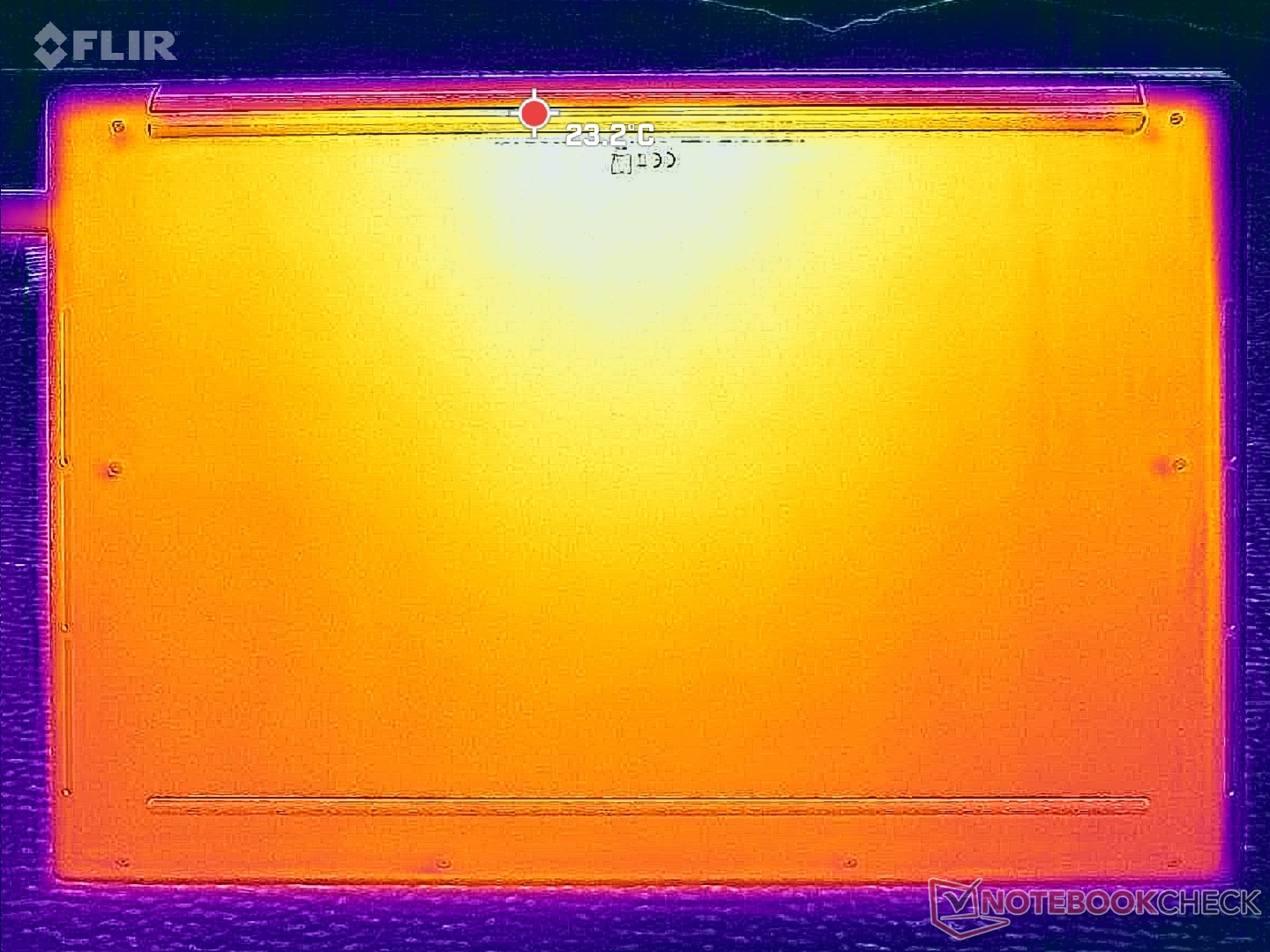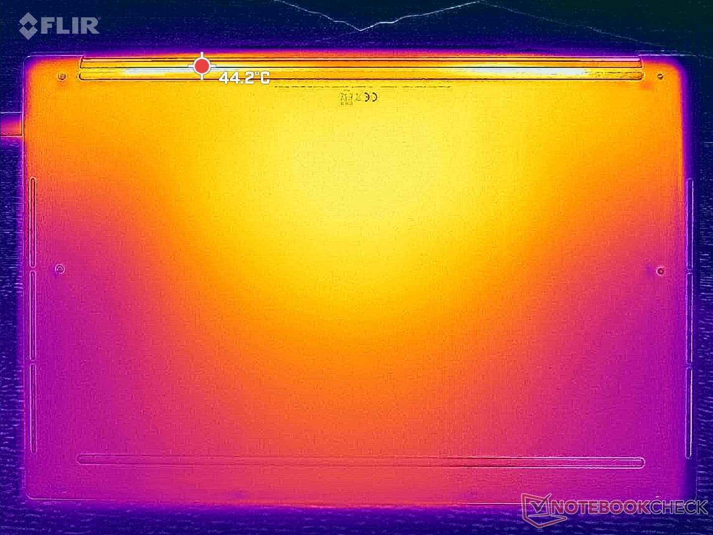 Gorące punkty na dolnej pokrywie w pobliżu otworów wentylacyjnych mogą osiągnąć prawie 45 ° C podczas pracy z wymagającymi obciążeniami. Nie możemy powstrzymać się od zastanawiania się, czy dodatkowe otwory wentylacyjne poprawiłyby ogólną temperaturę, ale Dell wyraźnie stawia na czystszy, pozbawiony otworów wentylacyjnych projekt wizualny, podobnie jak w przypadku serii MacBook.