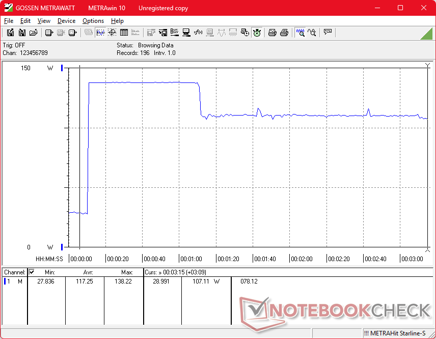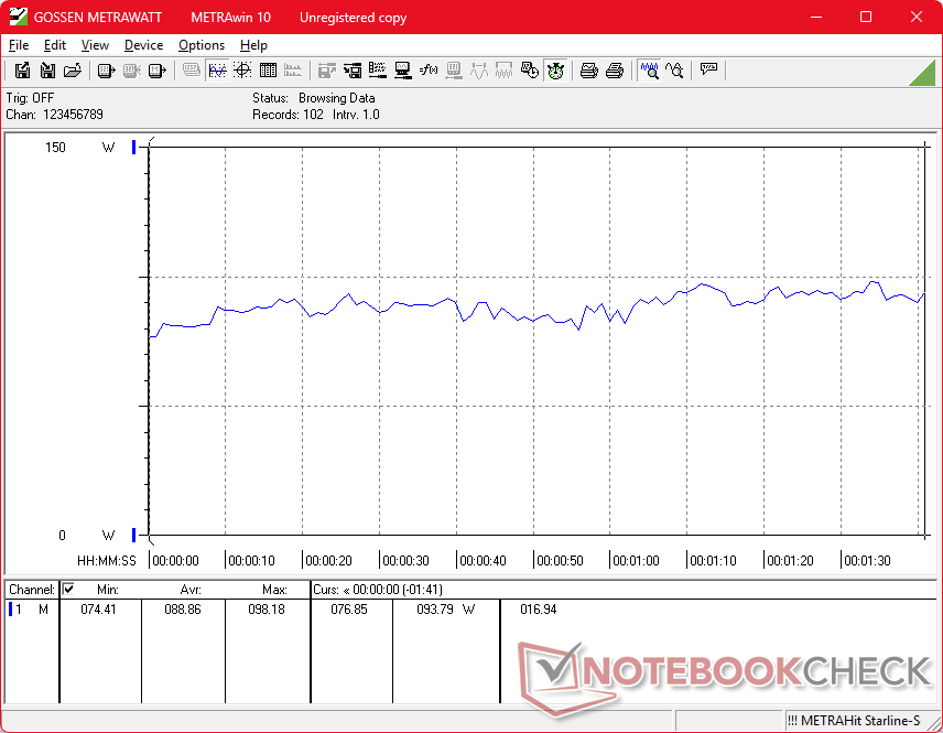 Praca na biegu jałowym na komputerze stacjonarnym może pobierać zaledwie 6 W w trybie oszczędzania energii z aktywnym iGPU lub do 33 W w trybie wydajności z aktywnym dGPU i ekranem OLED wyświetlającym głównie białe kolory (np. podczas przeglądania). Zużycie energii podczas pracy z bardziej wymagającymi obciążeniami jest poza tym podobne do zeszłorocznego modelu, jeśli nie nieco niższe w celu poprawy wydajności w przeliczeniu na wat, zwłaszcza że Dell 16 Premium jest dostarczany z tym samym zasilaczem USB-C o mocy 130 W (~ 12,8 x 5,5 x 2,3 cm), co poprzednio.