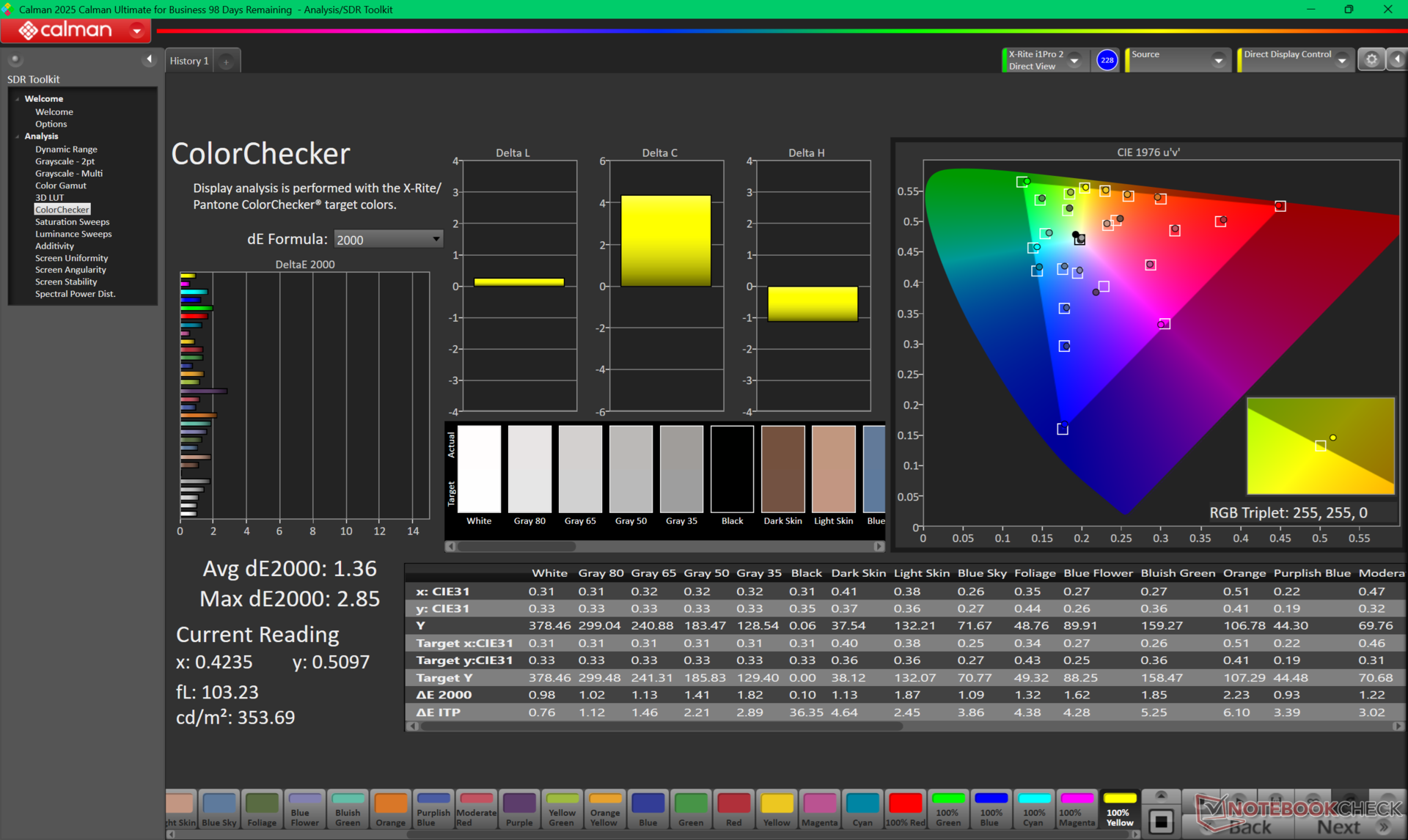 ΔE ColorChecker Calman: 1.36 | ∀{0.5-29.43 Ø4.79}