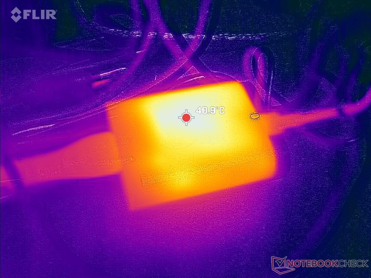 Lewa połowa laptopa jest cieplejsza niż prawa ze względu na umiejscowienie procesora. Gorące punkty na górze i na dole mogą osiągnąć nawet 40°C, co i tak jest znacznie niższą temperaturą niż w przypadku Galaxy Book3 Pro 14 gdzie powierzchnie mogą osiągać ponad 50 C. Dell nigdy nie czułby się niekomfortowo ciepły na skórze podczas użytkowania.