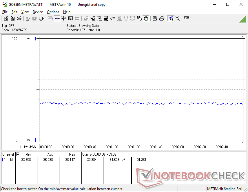 Jesteśmy w stanie zarejestrować maksymalny pobór mocy 87 W z małego (~ 12,5 x 4,8 x 3 cm) zasilacza sieciowego 90 W, gdy procesor jest wykorzystywany w 100 procentach. Zapotrzebowanie to jest tylko tymczasowe, zanim zacznie się dławienie, jak pokazują poniższe wykresy zużycia energii.