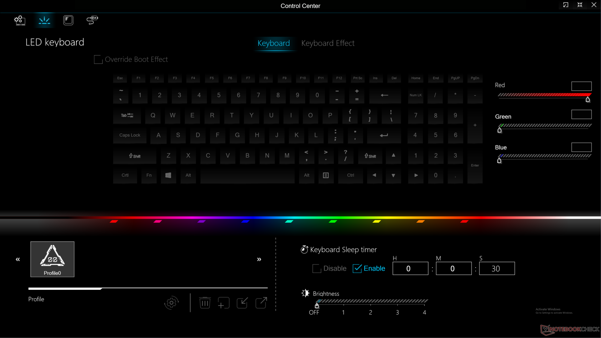 Przed uruchomieniem poniższych testów porównawczych ustawiliśmy system Windows i Centrum sterowania na tryb wydajności z aktywnym maksymalnym wentylatorem. Ręczny przełącznik GPU można również znaleźć w Centrum sterowania, ale jest on niewygodnie ukryty za paskiem przewijania. G-Sync jest obsługiwany, podczas gdy Advanced Optimus nie, co oznacza, że podczas przełączania między iGPU i dGPU wymagane jest ponowne uruchomienie komputera.