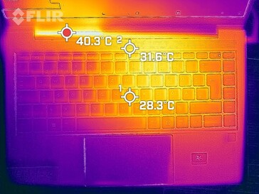 Podczas gdy temperatury laptopa prawie nie zmieniają się w trybie bezczynności, zmierzyliśmy punkt ciepła do 42 ° C przy średnim obciążeniu. Jest to temperatura letnia i w rezultacie nie jest zbyt zauważalna podczas korzystania z urządzenia.