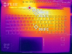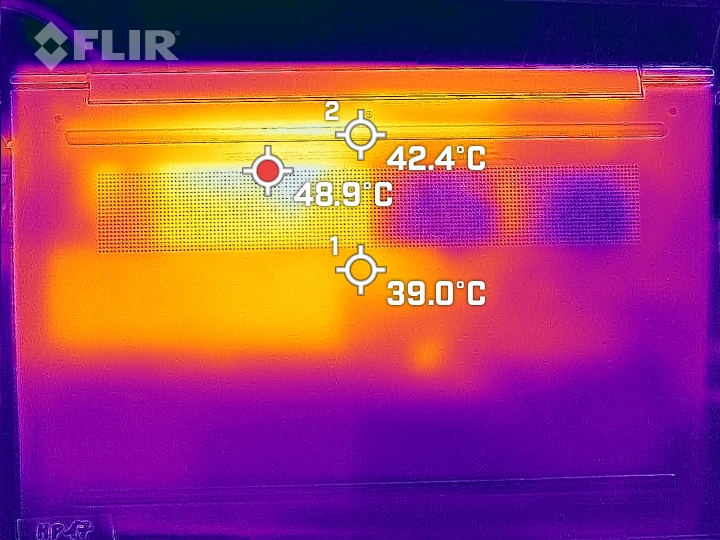 W stanie spoczynku laptop jest niewiele cieplejszy od temperatury pokojowej. Pod obciążeniem w centrum przed ekranem powstaje punkt ciepła, który rozszerza się w kierunku klawiatury, osiągając temperaturę bliską 50°C (122°F). Choć to nagrzewanie jest odczuwalne podczas pisania, nie staje się zbyt niekomfortowe.