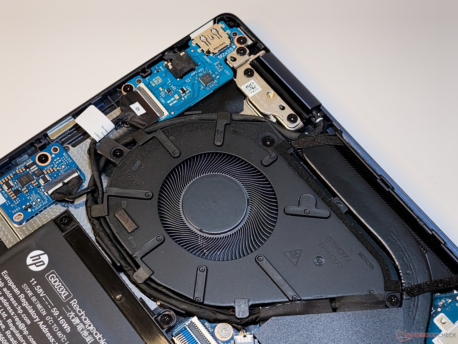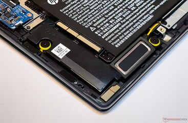 Widzimy gęsto upakowany układ, w którym tylko dysk SSD NVMe i karta WLAN są komponentami, które można rozbudować. Karta WLAN znajduje się tuż obok procesora, ukryta pod izolacją. Akumulator o pojemności 59 Wh można odkręcić i wymienić w razie potrzeby.