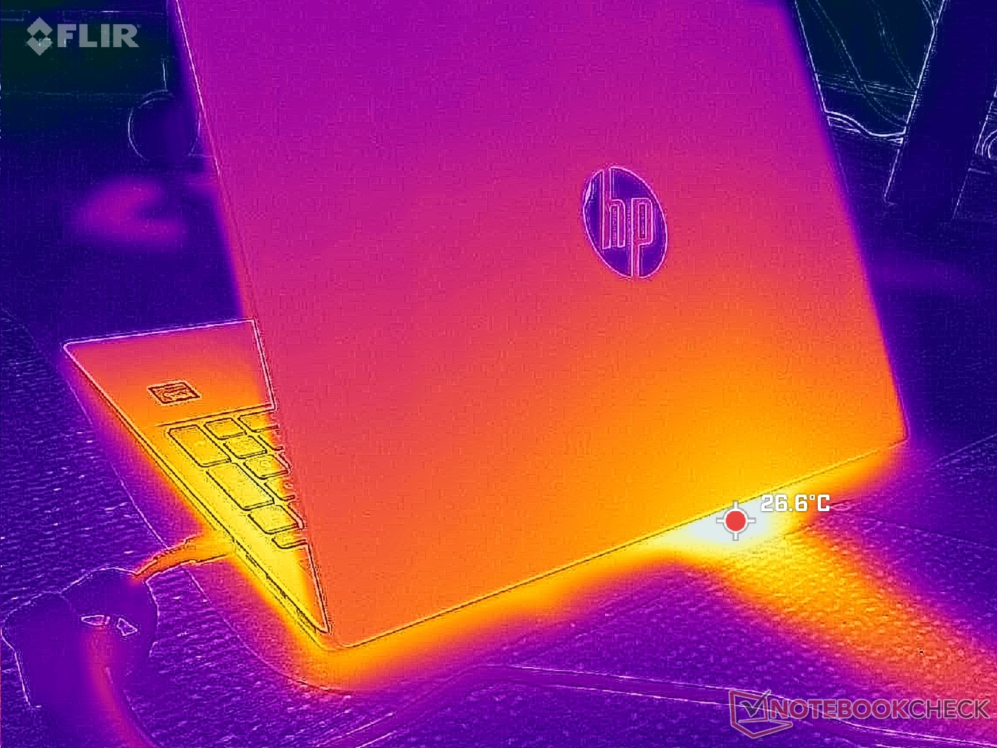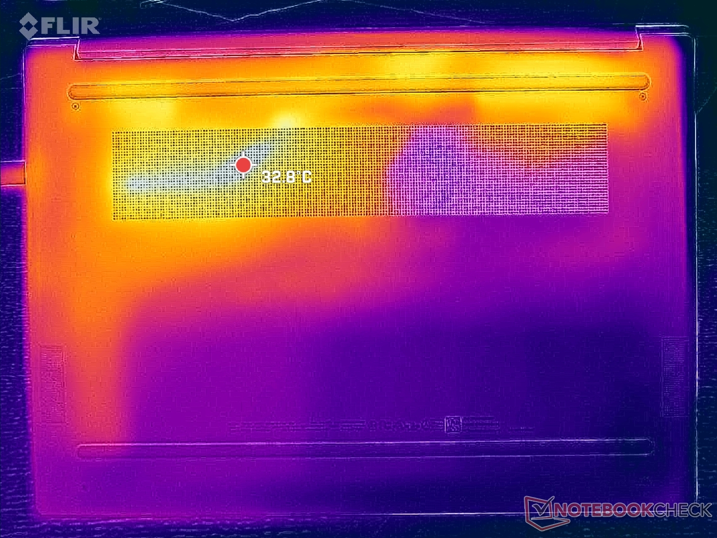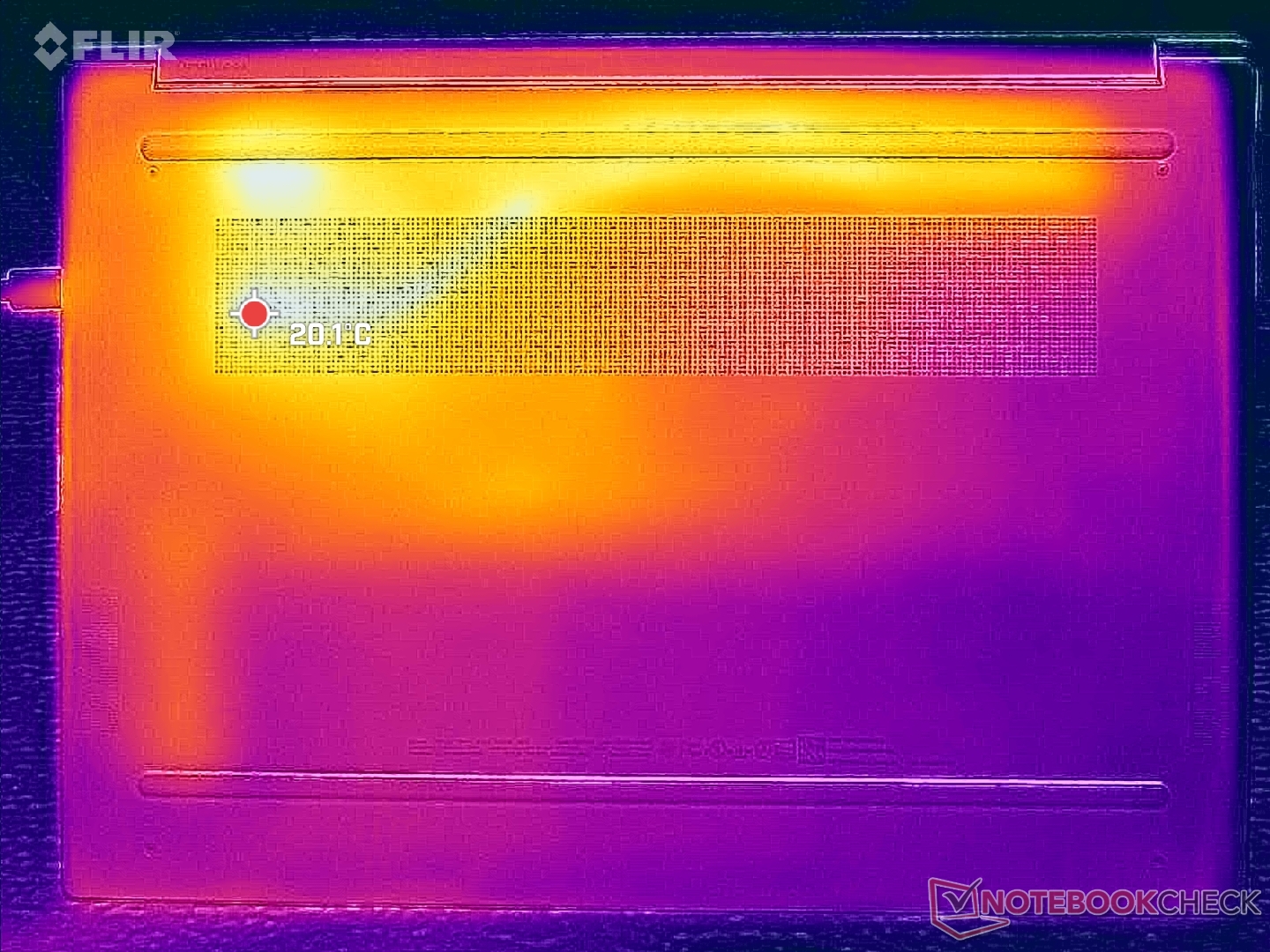 Prawa połowa obudowy staje się zauważalnie cieplejsza niż lewa ze względu na zastosowane w niej rozwiązanie chłodzące. Jednak gorące punkty nigdy nie stają się niewygodne, ponieważ procesor Core z serii U nie jest zbyt wymagający.