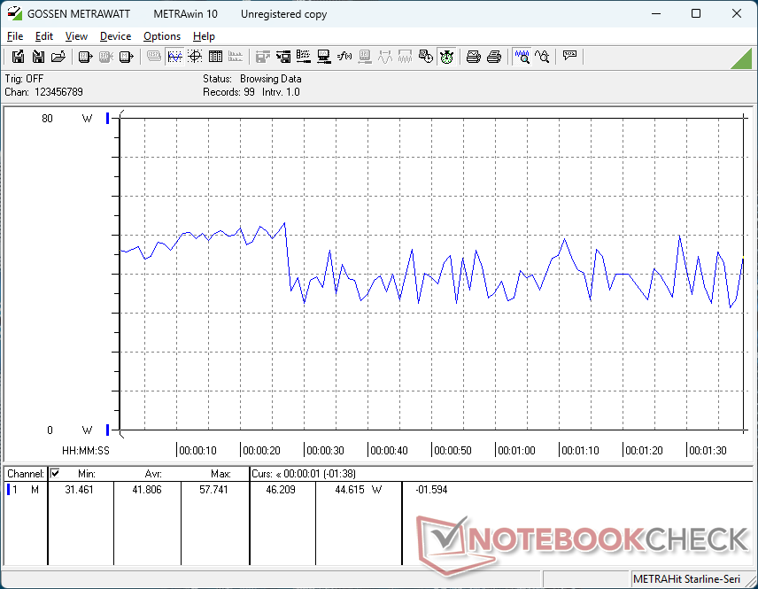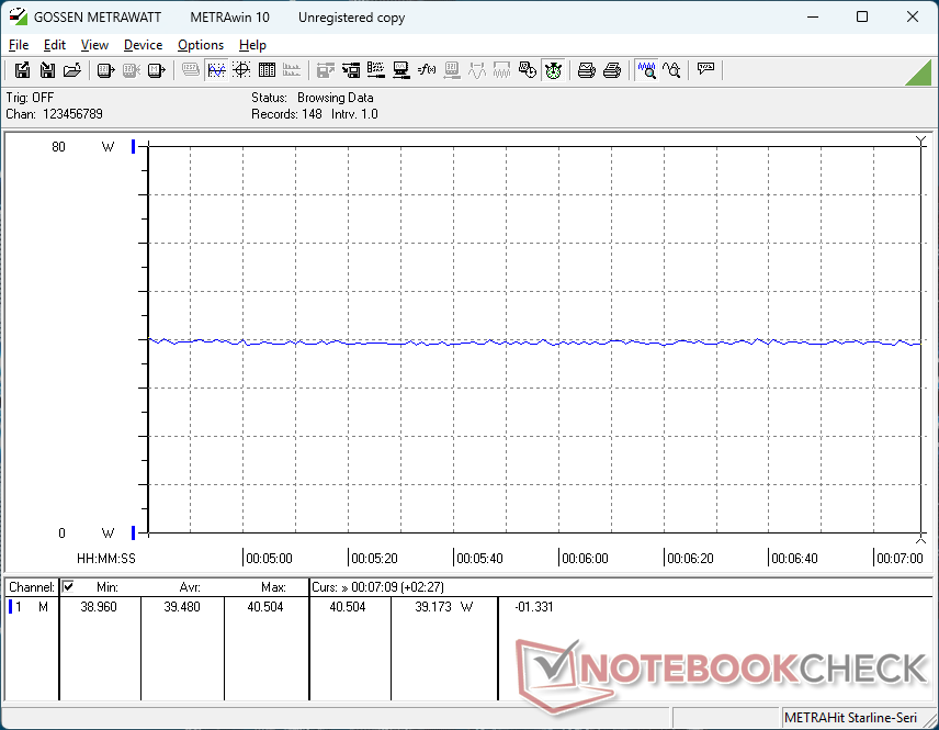 Całkowite zużycie energii jest zbliżone do tego, które odnotowaliśmy na zasilanym przez Lunar Lake V Dell 16 Plus zapewniając jednocześnie podobną wydajność procesora, ale znacznie wolniejszą wydajność grafiki. Niewielki zasilacz sieciowy USB-C o mocy 65 W jest wystarczający dla poziomu wydajności i zapotrzebowania na energię.