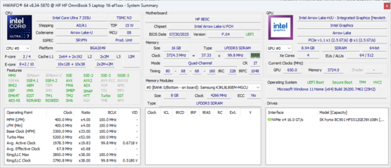 | HP Omnibook 5 16-af1037nr Intel Core Ultra 7 255U ⎘ Intel Graphics 4-Core iGPU (Meteor / Arrow Lake) ⎘ 16 GB Pamięć | Amazon: $1,225.00 Cena katalogowa: 660 USD | 1.7 kg | 18.6 mm | 16.00" 1920x1200 142 PPI IPS | |