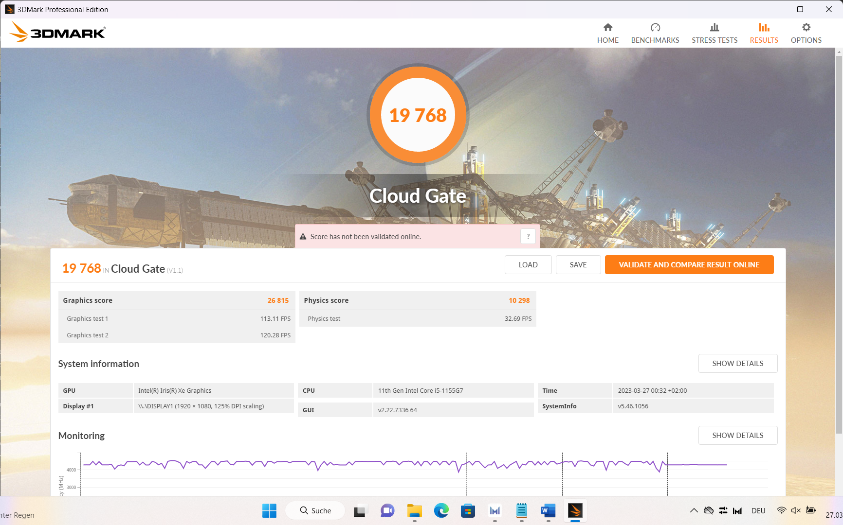 W połączonym teście obciążeniowym (FurMark+Prime95) taktowanie CPU spada z 3,5 GHz poniżej taktowania bazowego do 1,85 GHz po około 40 sekundach, a temperatury rdzeni oscylują na poziomie 63°C. W przypadku iGPU spadek jest znacznie mniejszy i wynosi 1 080 MHz. W stresie FurMark osiąga on swoje pełne 1 350 MHz. Czysty stres CPU prowadzi do stabilnych częstotliwości rdzenia na poziomie 2,8 GHz i temperatur rdzenia na poziomie 73 °C.