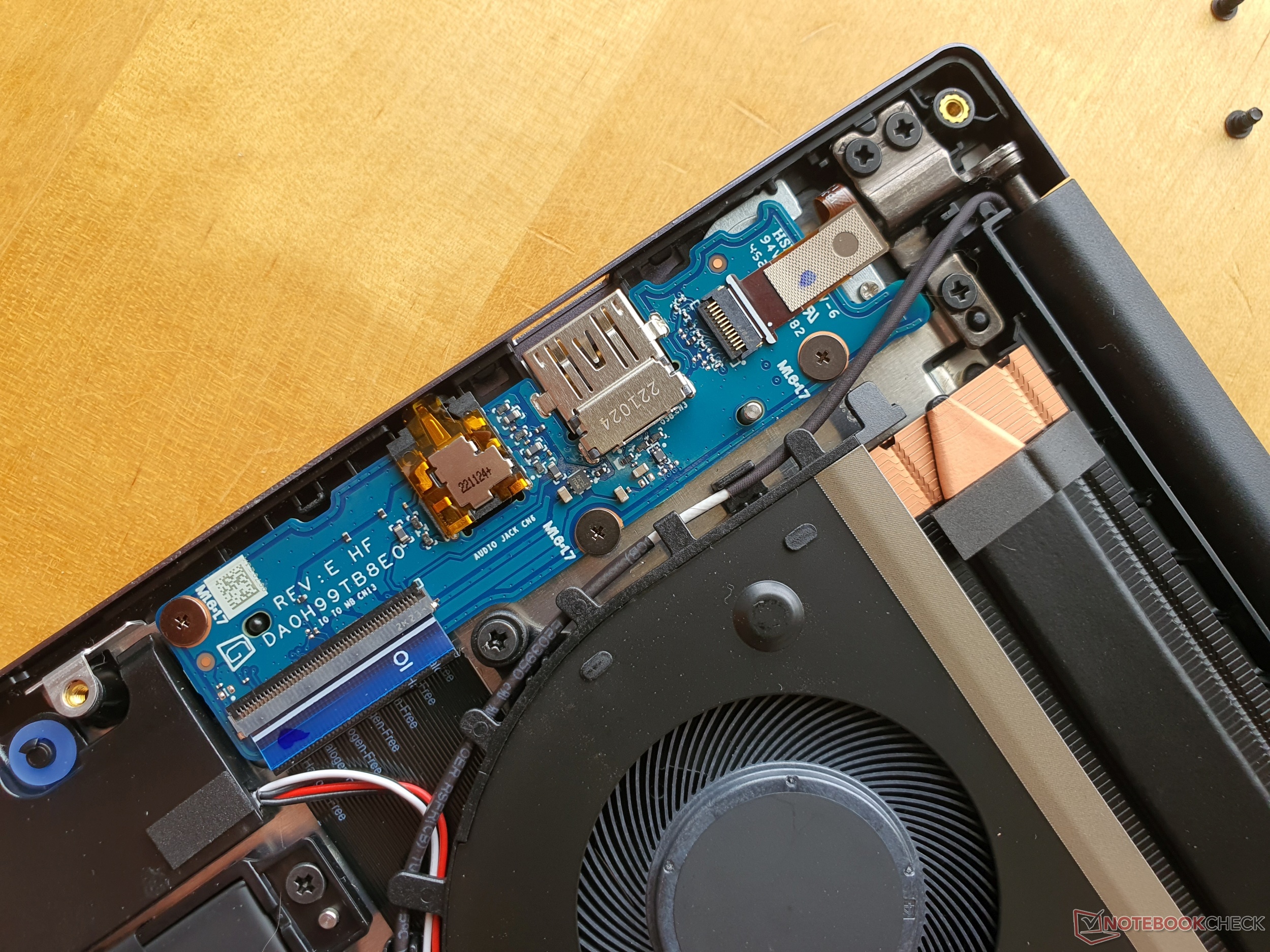 Po odkręceniu dziesięciu śrub Torx T5 bardzo łatwo dostać się do wnętrza MateBooka. Niewiele można tu jednak zrobić. Bez większego wysiłku można wymienić tylko dysk SSD M.2-2280 i przykręcony akumulator 57 Wh. Pamięć RAM i układ Wi-Fi są zainstalowane na stałe (przylutowane).