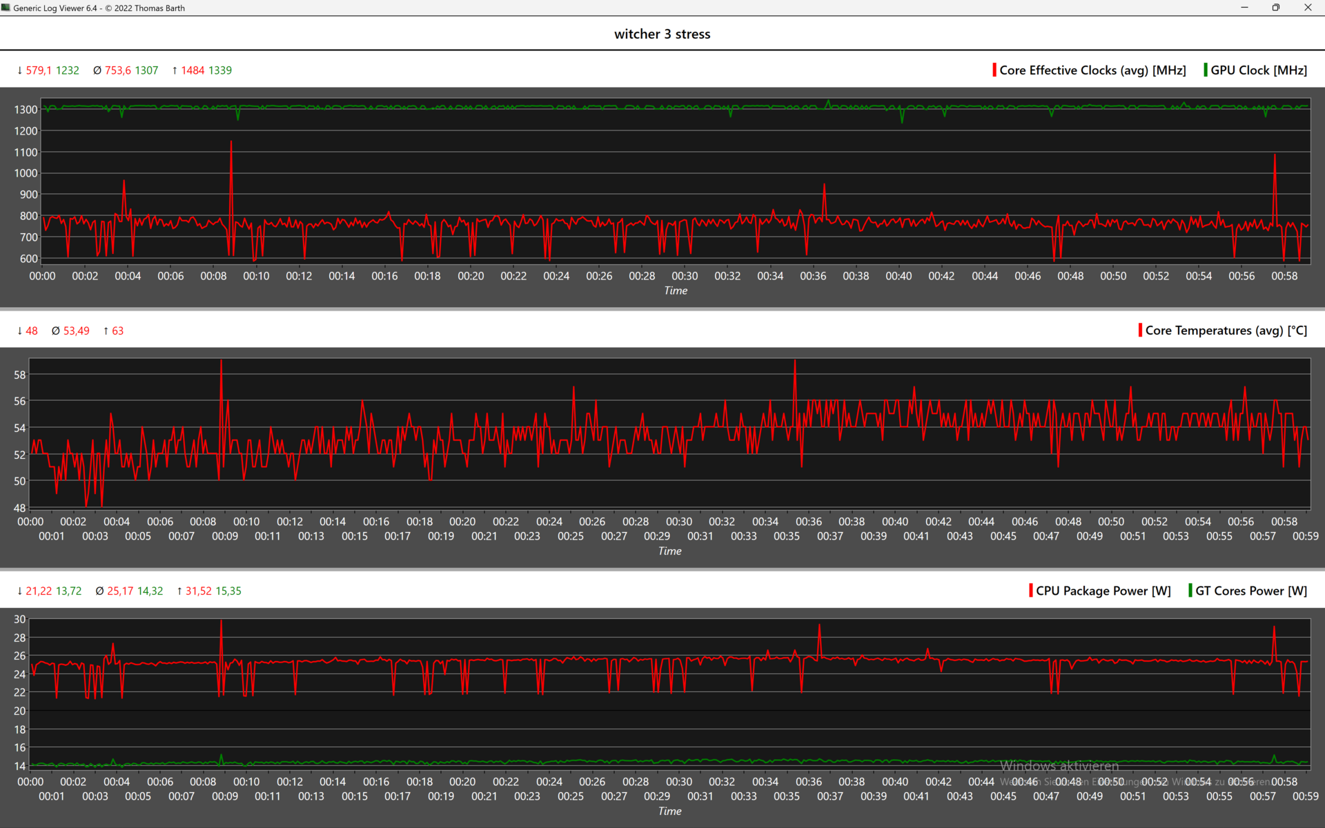 W połączonym teście obciążeniowym (FurMark+Prime95) taktowanie CPU z 3,3 GHz spada poniżej bazowego do 1,9 GHz, a temperatura rdzenia jest niska i wynosi 63°C. Faworyzowane jest iGPU, które jest tylko o 15 procent niższe od maksymalnego taktowania 1 100 MHz. W czystym stresie procesora jest to 2 GHz dla CPU przy zaledwie 50 °C.