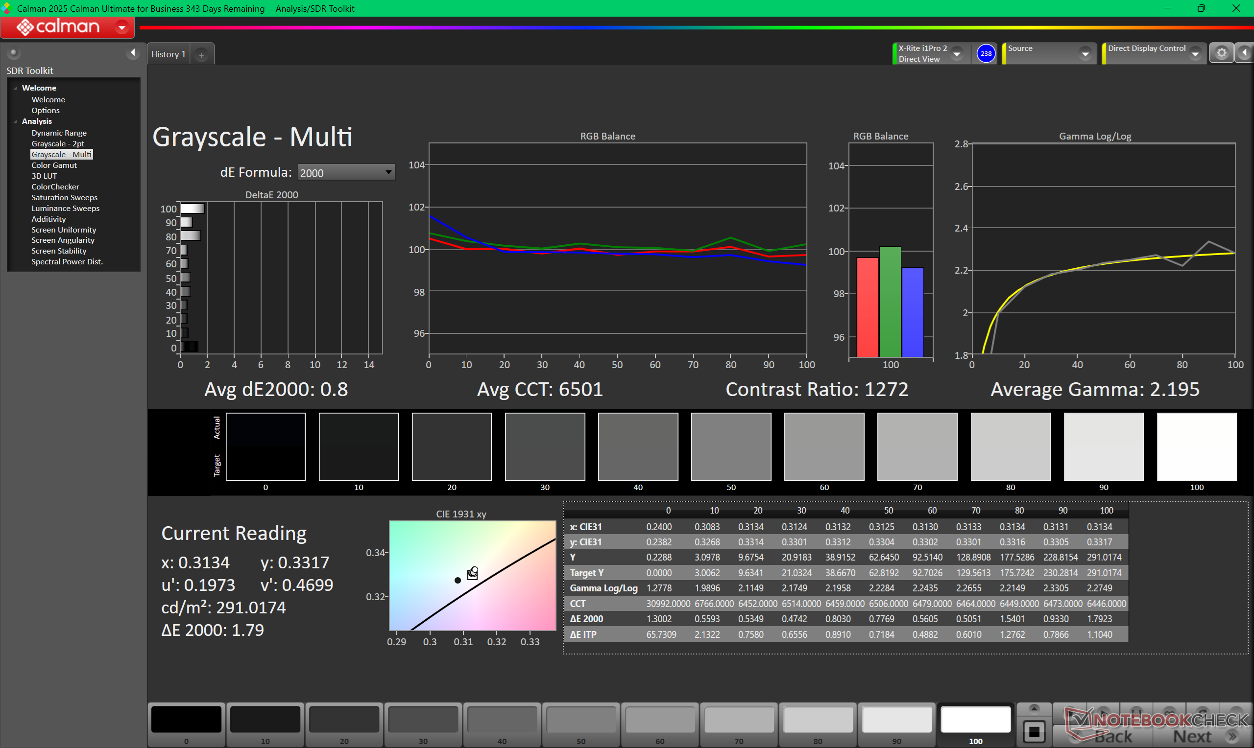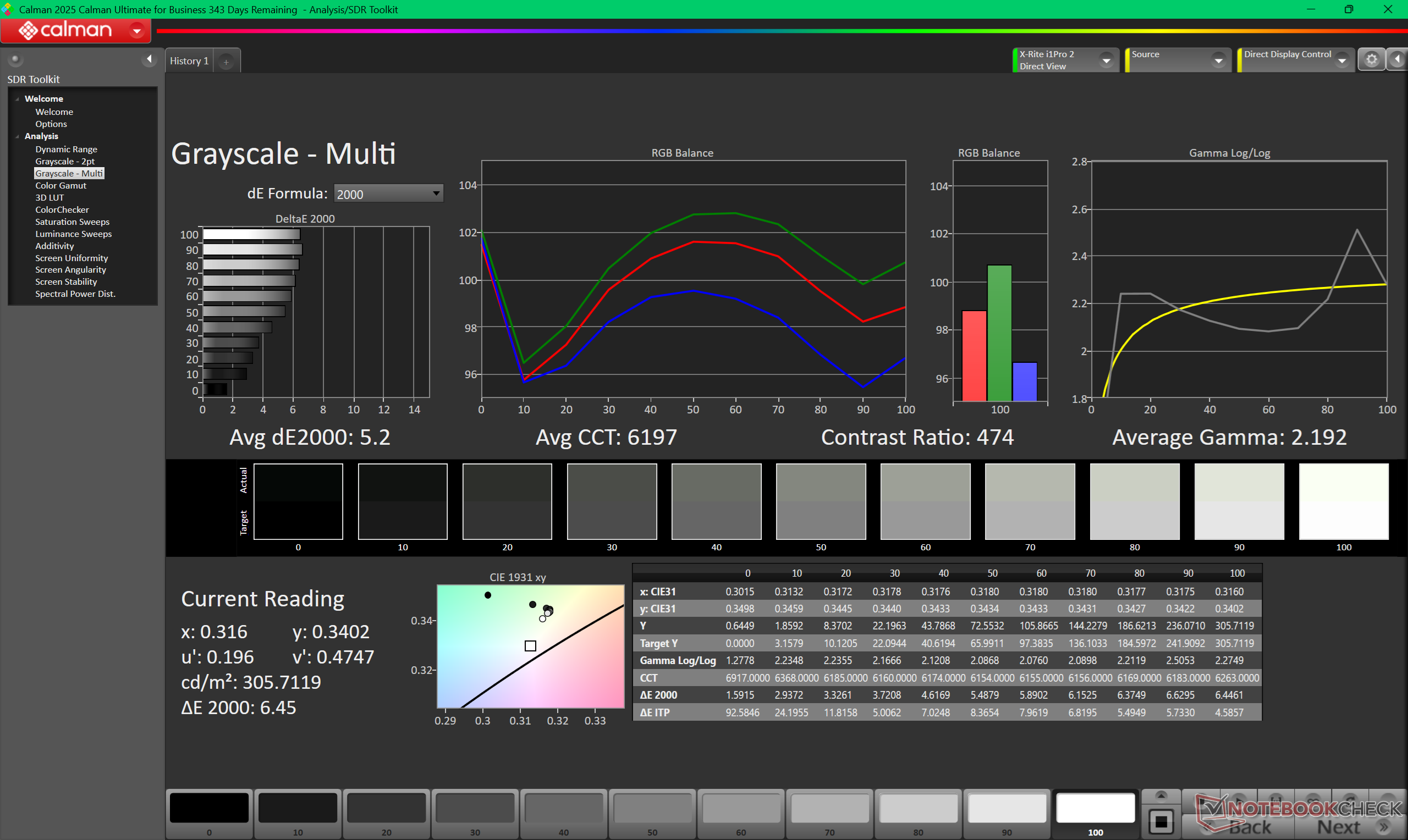Wyświetlacz jest słabo skalibrowany po wyjęciu z pudełka, czego można oczekiwać od budżetowego laptopa. Kalibracja za pomocą naszego kolorymetru X-Rite znacznie poprawiłaby średnie wartości DeltaE skali szarości i kolorów z odpowiednio 5,2 i 6,78 do zaledwie 0,8 i 2,73.