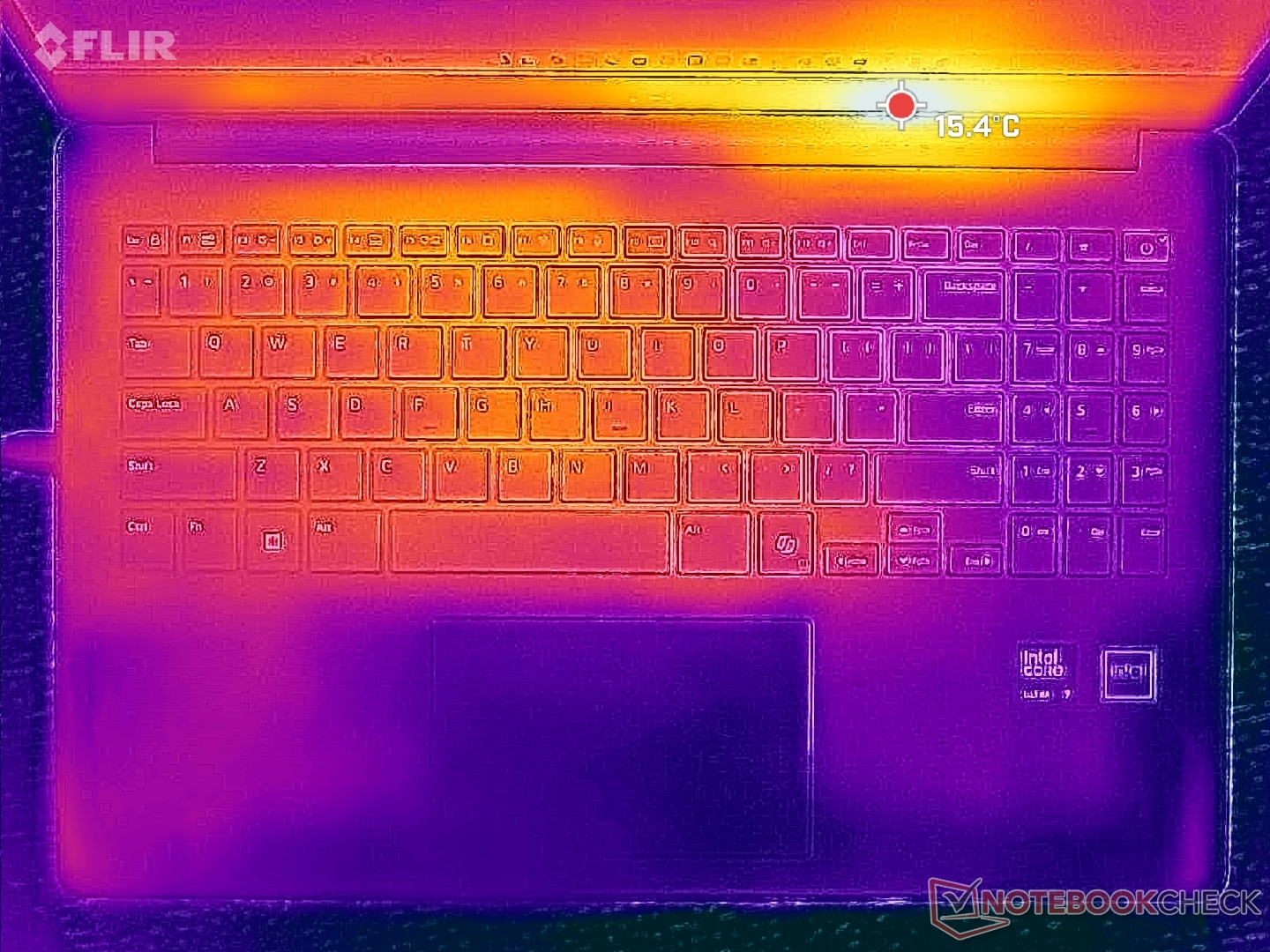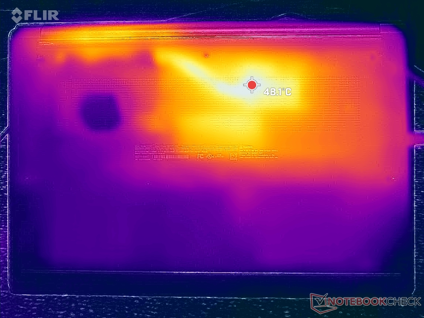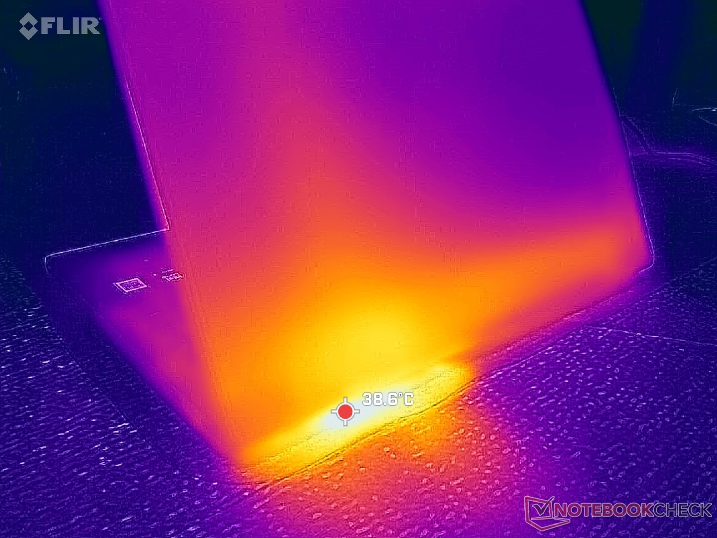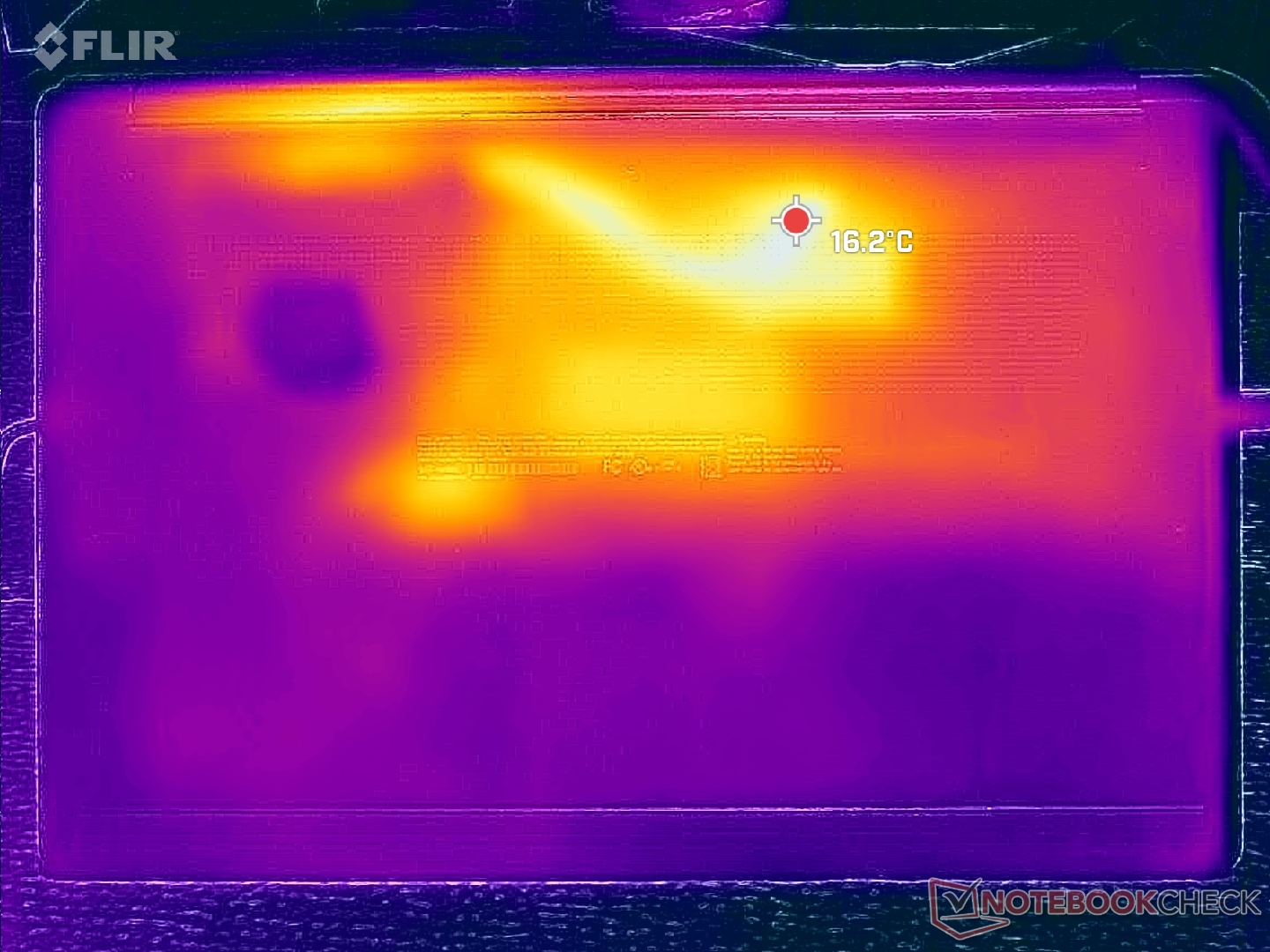 Miejsca o wysokiej temperaturze powierzchni mogą stać się znacznie cieplejsze na dolnej pokrywie niż na pokładzie klawiatury nawet o 9 ° C, jak pokazują poniższe mapy temperatur. Średnia temperatura jest jednak zauważalnie niższa niż ta, którą odnotowaliśmy na 2023 LG Gram SuperSlim.