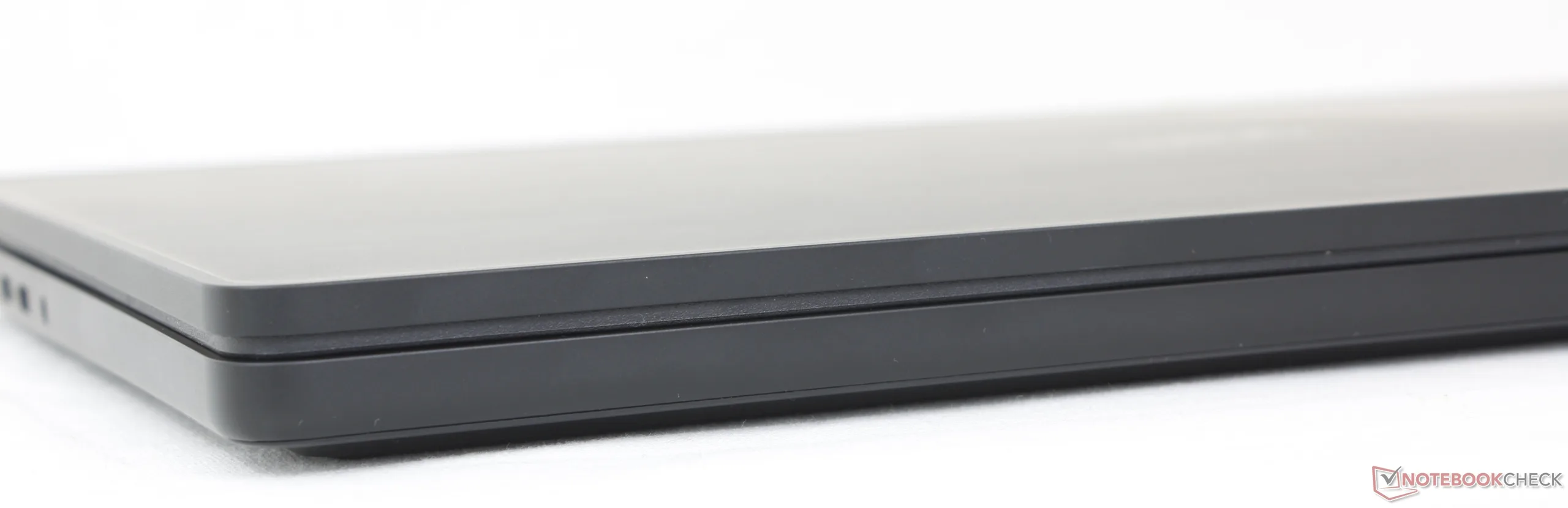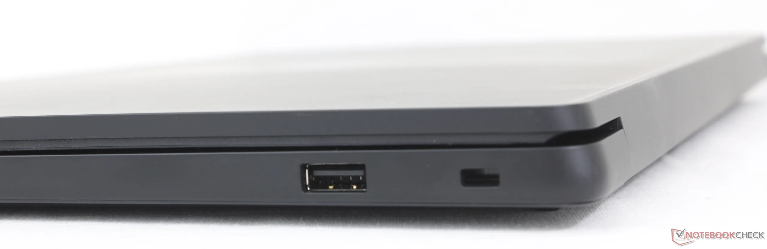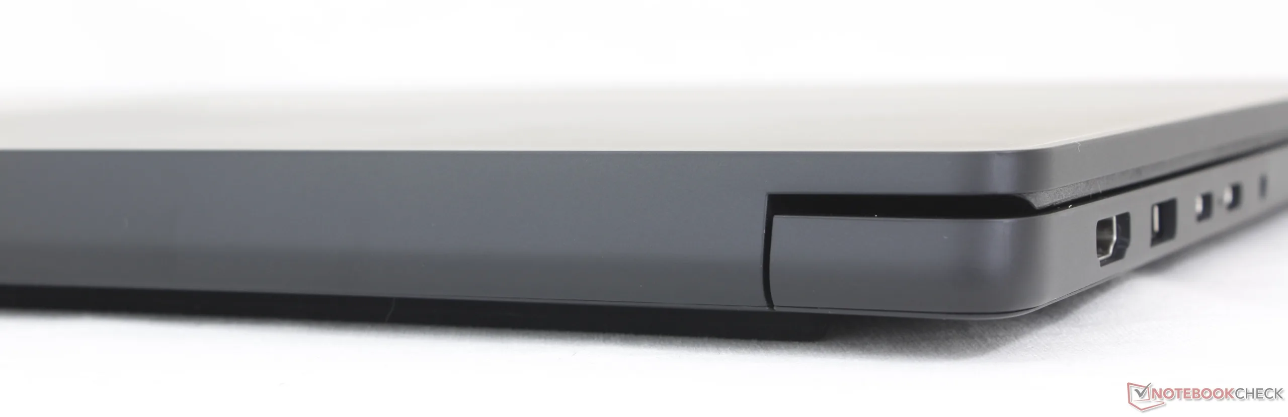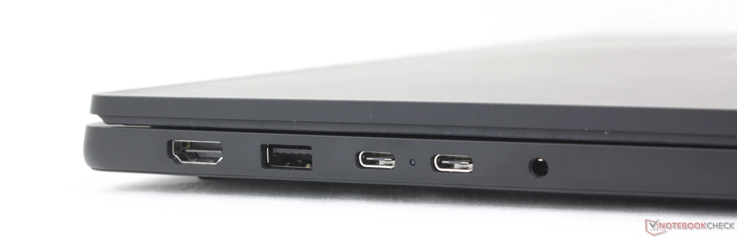 Opcje portów są zasadniczo identyczne jak w 2025 HP Envy x360 15 ale bez oficjalnej obsługi Thunderbolt. Niestety, ładowanie musi odbywać się przez lewą krawędź, ponieważ wzdłuż prawej krawędzi nie ma portów USB-C.