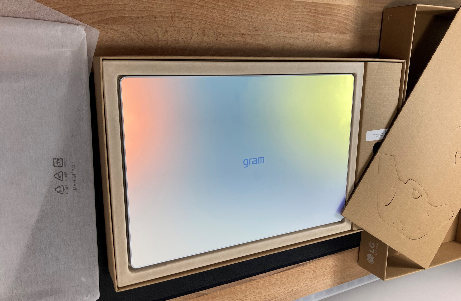 Oprócz ładowarki, kabla USB-C do USB-C (nadaje się tylko do ładowania) i materiałów gwarancyjnych, w pudełku nie ma żadnych dodatkowych akcesoriów. Samo opakowanie składa się niemal wyłącznie z kartonu pochodzącego z recyklingu, co zasługuje na pewną pochwałę. Niestety, sam LG Gram jest umieszczony w plastikowej obudowie wykonanej z mieszanych materiałów, więc nie można jej poddać recyklingowi.