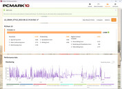 Temperatury i maksymalne prędkości zegara pozostają stabilne podczas testu warunków skrajnych, z wyjątkiem pierwszej minuty przy najwyższym obciążeniu. Następnie zużycie energii, temperatury procesora i prędkości zegara spadają, ale pozostają stabilne przez resztę testu. Interesująca jest zmiana z trybu "Bez hałasu" na tryb "Cichy" przy pełnym obciążeniu. Podczas gdy temperatura procesora spada o 10 °C (18 °F), średnia prędkość zegara wzrasta o 50%.