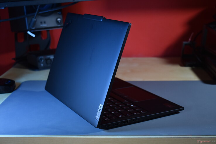Dzięki wysokiej jakości lekkim metalom użytym jako komponenty podstawy laptopa, trudno go skręcić; podpórka pod nadgarstki i klawiatura również nie ustępują. Karbonowa pokrywa wyświetlacza jest nieco bardziej elastyczna, ale mimo to z łatwością amortyzuje nacisk na tylną część panelu. Częścią tego nowego projektu jest powrót do całkowicie czarnego wykończenia, które jak zawsze jest aksamitnie miękkie - ale niestety sprawia, że zabrudzenia i plamy tłuszczu wyglądają bardzo zauważalnie. Zawiasy i logo ThinkPad - które tradycyjnie zawsze były srebrne - są teraz również czarne, co wygląda bardziej nowocześnie.