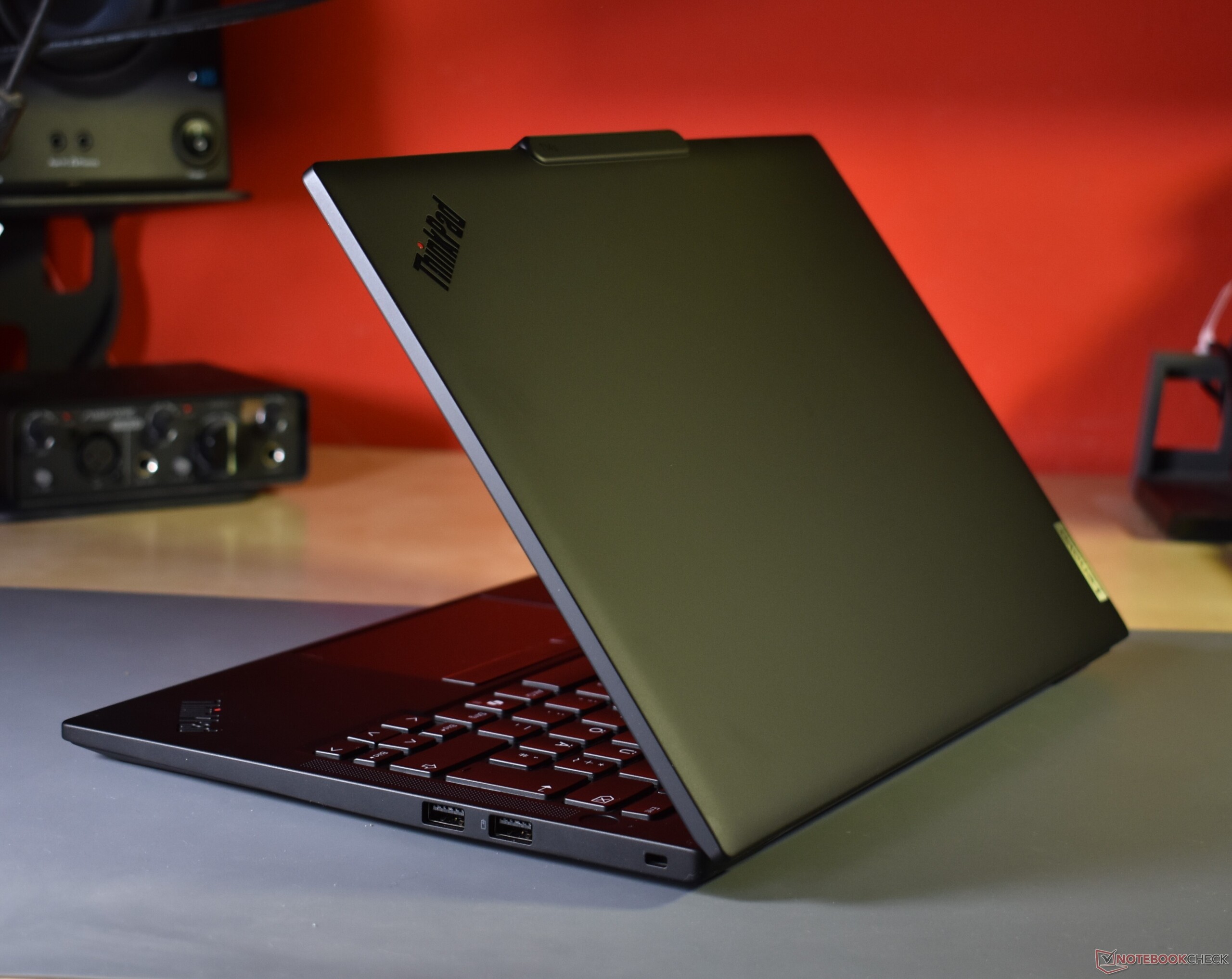 Pomimo wyższej liczby genów: Na zewnątrz Lenovo ThinkPad T14s Gen 5 i Lenovo ThinkPad T14s Gen 6 wyglądają jak identyczne bliźniaki. Lenovo przenosi większość konstrukcji modelu Intela, który pod względem wyglądu bardziej niż kiedykolwiek wcześniej pasuje do ThinkPada X1 Carbon. Ramki ekranu są teraz znacznie mniejsze, a szeroki zawias paskowy jest również używany w X1 od 2021 roku. Podobnie jak tamto urządzenie, ThinkPad T14s Gen 6 jest wykonany głównie z lekkich stopów metali, a mianowicie magnezu i aluminium w przypadku jednostki bazowej. Pokrywa ekranu wykonana jest z tworzywa sztucznego wzmocnionego włóknem węglowym. Jakość wykonania i stabilność są doskonałe. W dotyku T14s G6 jest "typowym ThinkPadem": Wszystkie powierzchnie, z wyjątkiem chropowatej plastikowej ramki ekranu, są pomalowane matową czarną powłoką, która sprawia wrażenie lekko gumowanej. Daje to komfortowe uczucie, gdy dłonie spoczywają na laptopie, ale materiały te mogą się również łatwo zabrudzić. Czyszczenie tego urządzenia nie jest opcjonalne.