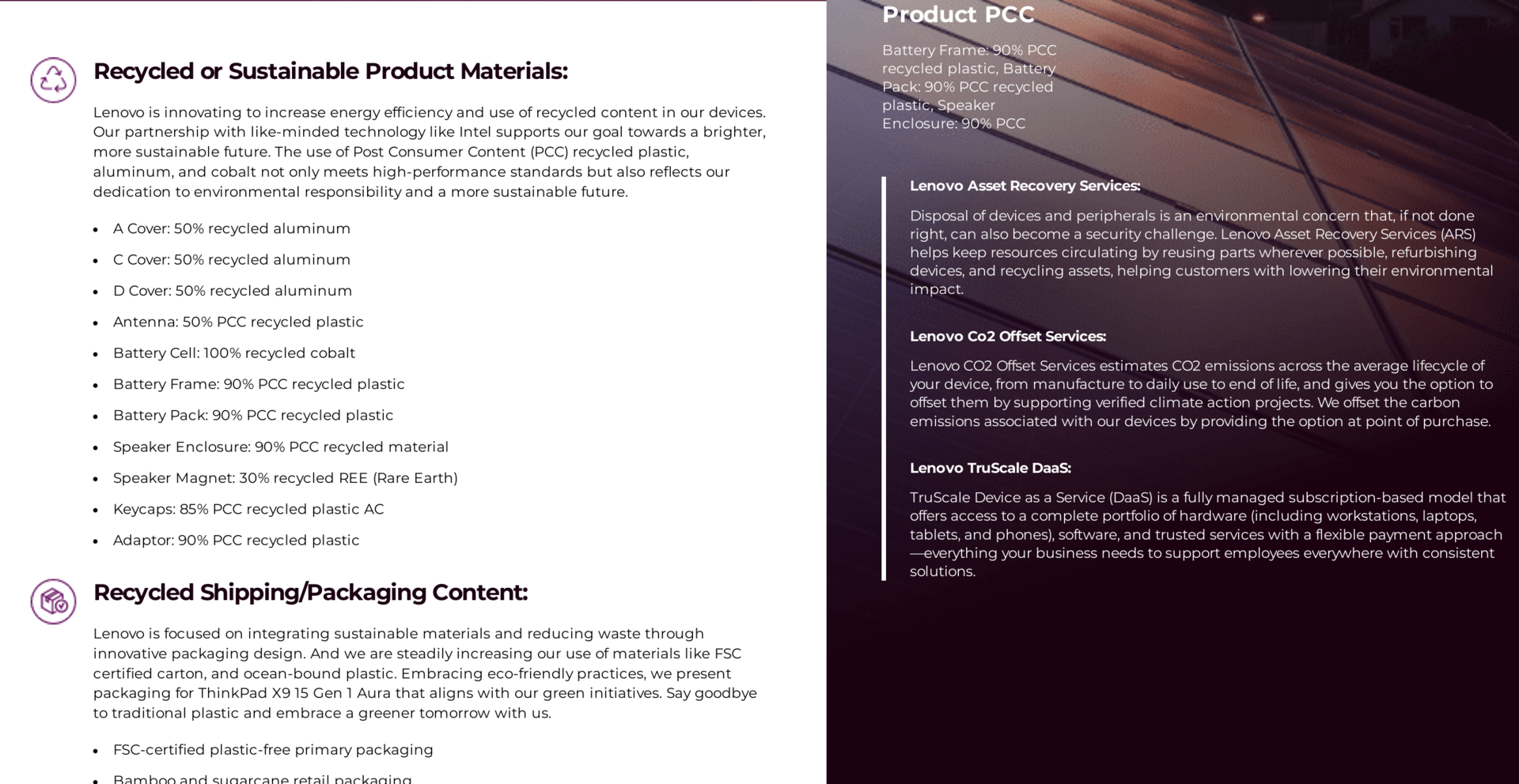 Zrównoważony rozwój jest ważnym tematem dla Lenovo, a ThinkPad X9 nie tylko spełnia kryteria wielu certyfikatów środowiskowych, ale także wykorzystuje wiele materiałów pochodzących z recyklingu dla samego laptopa i opakowania. Istnieje również kompensacja CO2 (poprzez projekty środowiskowe) w oparciu o przewidywany okres użytkowania produktu.