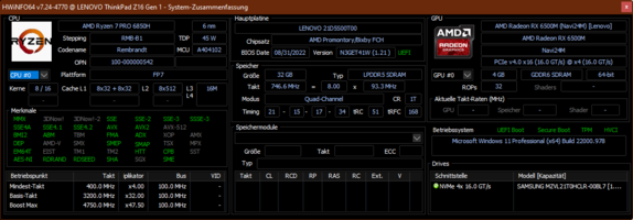 | 87.3 % v7 (old) | 10/2022 | Lenovo ThinkPad Z16 G1 21D5S00T00 R7 PRO 6850H, Radeon RX 6500M | 1.9 kg | 15.8 mm | 16.00" | 1920x1200 | |