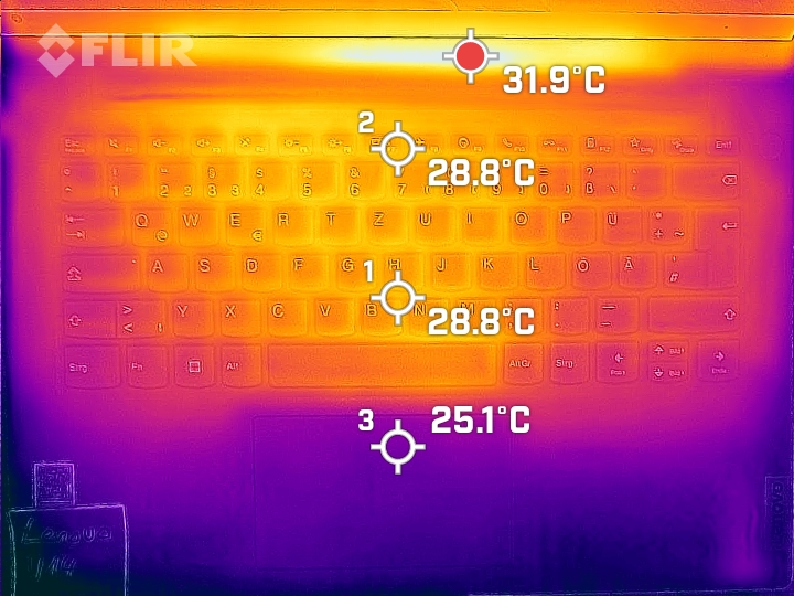 (+) Podpórki pod nadgarstki i touchpad są chłodniejsze niż temperatura skóry i maksymalnie 27.9 °C / 82.2 F i dlatego są chłodne w dotyku.