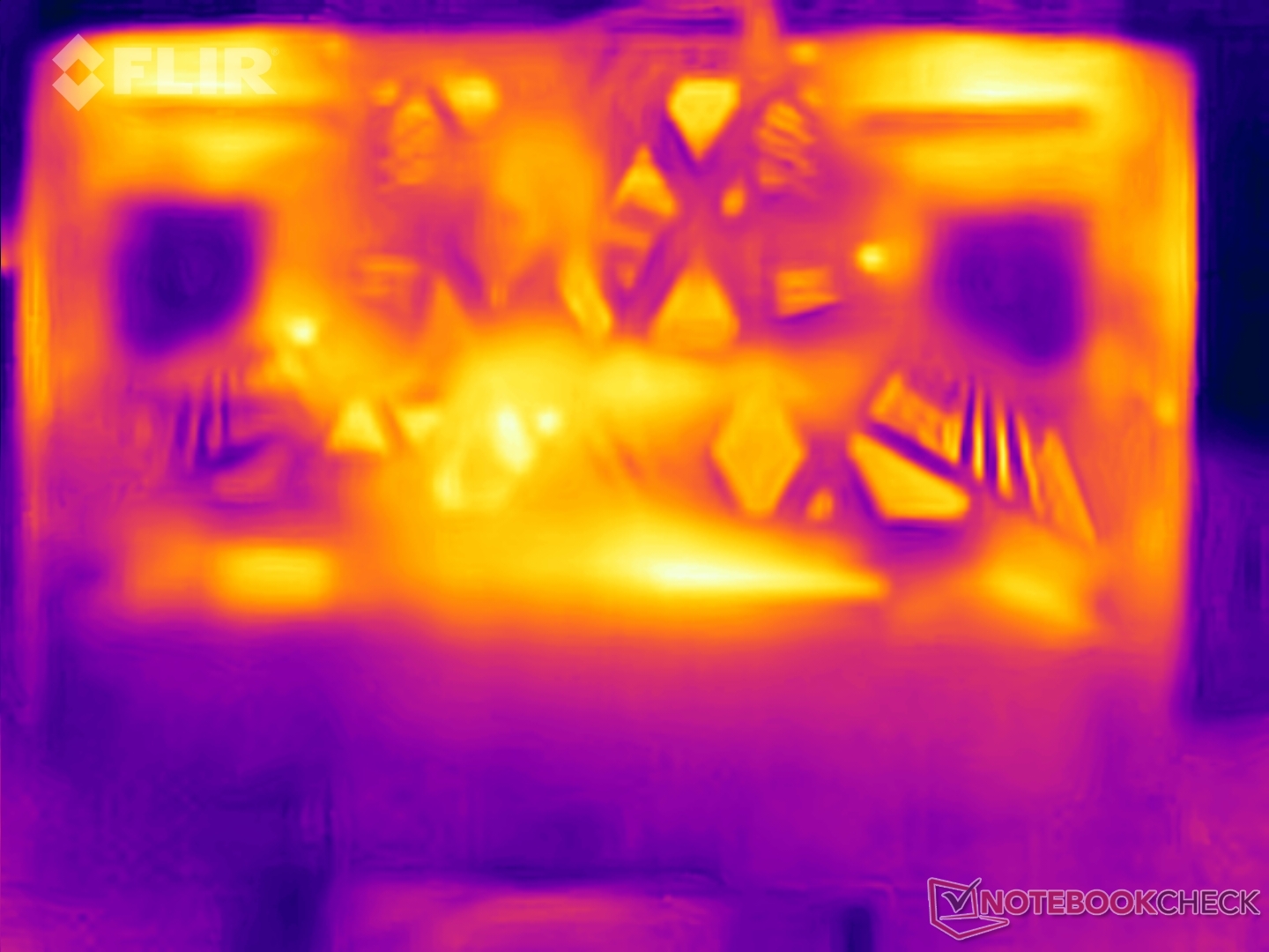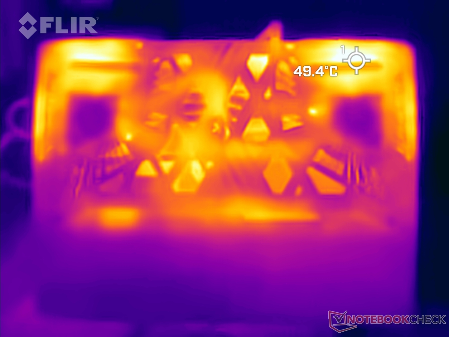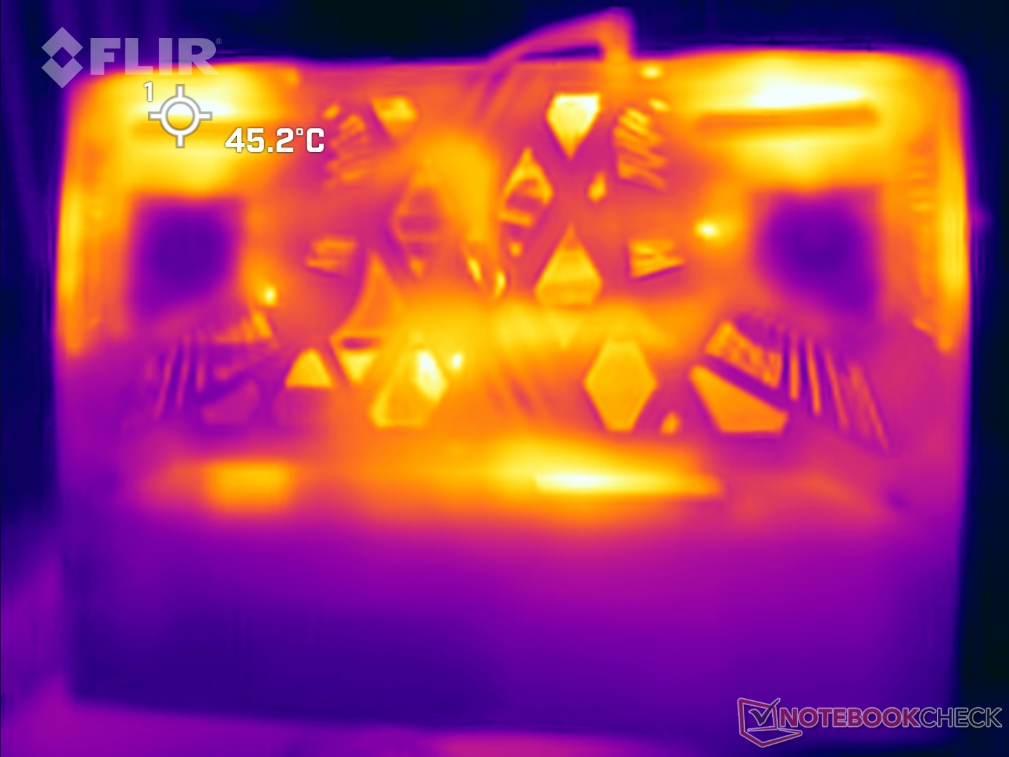 Temperatury powierzchni mogą osiągnąć do 45 °C na górnej stronie i prawie 49 °C na spodzie pod obciążeniem w trybie ekstremalnej wydajności.