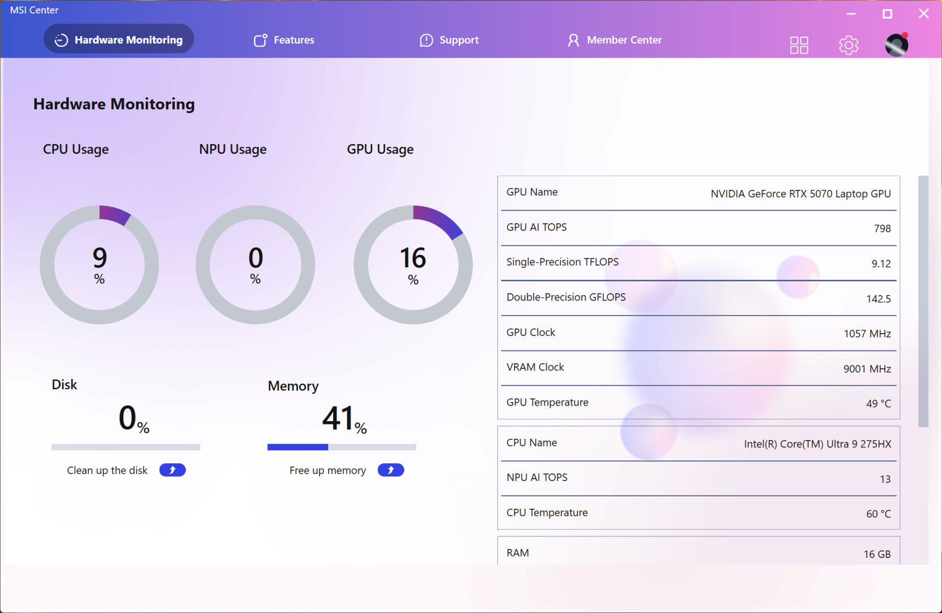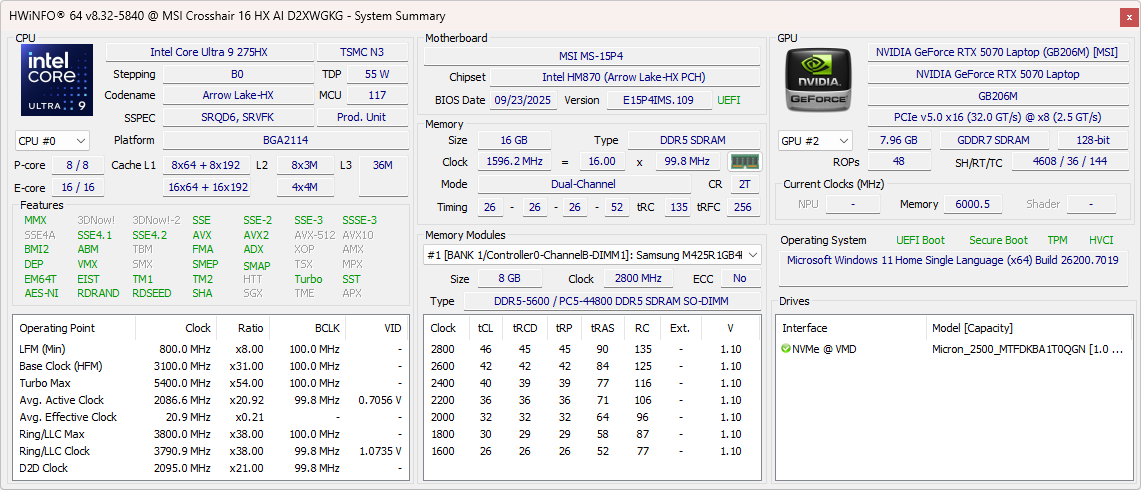 Nasza jednostka Crosshair 16 HX AI jest wyposażona w procesor Core Ultra 9 275HX i 115-watowy procesor graficzny RTX 5070 Laptop wraz z 16 GB pamięci DDR5-5600, 1 TB NVMe SSD i wyświetlaczem QHD + 240 Hz na poziomie IPS w dobrze znanej obudowie Crosshair 16 HX D14 obudowie.