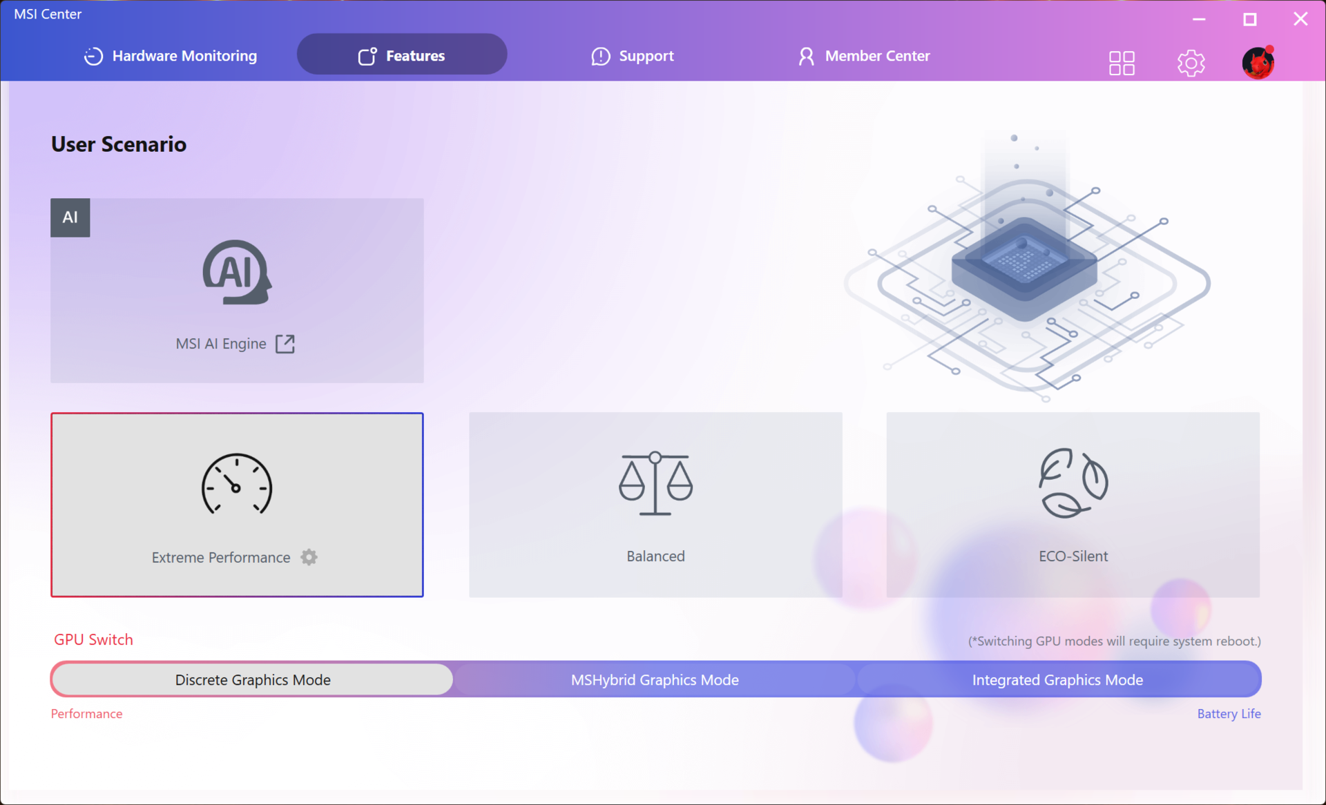 Tryb ekstremalnej wydajności uwalnia pełny potencjał Crosshair 16 HX AI, ale wiąże się to ze zwiększoną emisją ciepła i hałasu oraz wyższym poborem mocy.