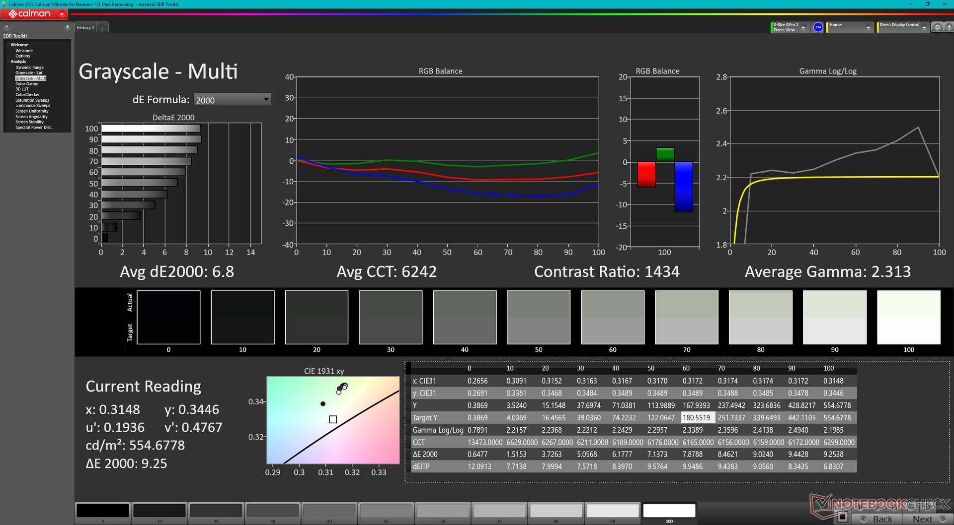 Wyświetlacz nie jest skalibrowany po wyjęciu z pudełka, pomimo szerokiego zakresu kolorów P3. Temperatura kolorów jest zbyt ciepła, a średnie wartości deltaE skali szarości i kolorów są wyższe niż oczekiwano i wynoszą odpowiednio 6,8 i 4,44. Kalibracja za pomocą naszego kolorymetru X-Rite rozwiązuje te problemy, aby lepiej wykorzystać głębokie kolory panelu.