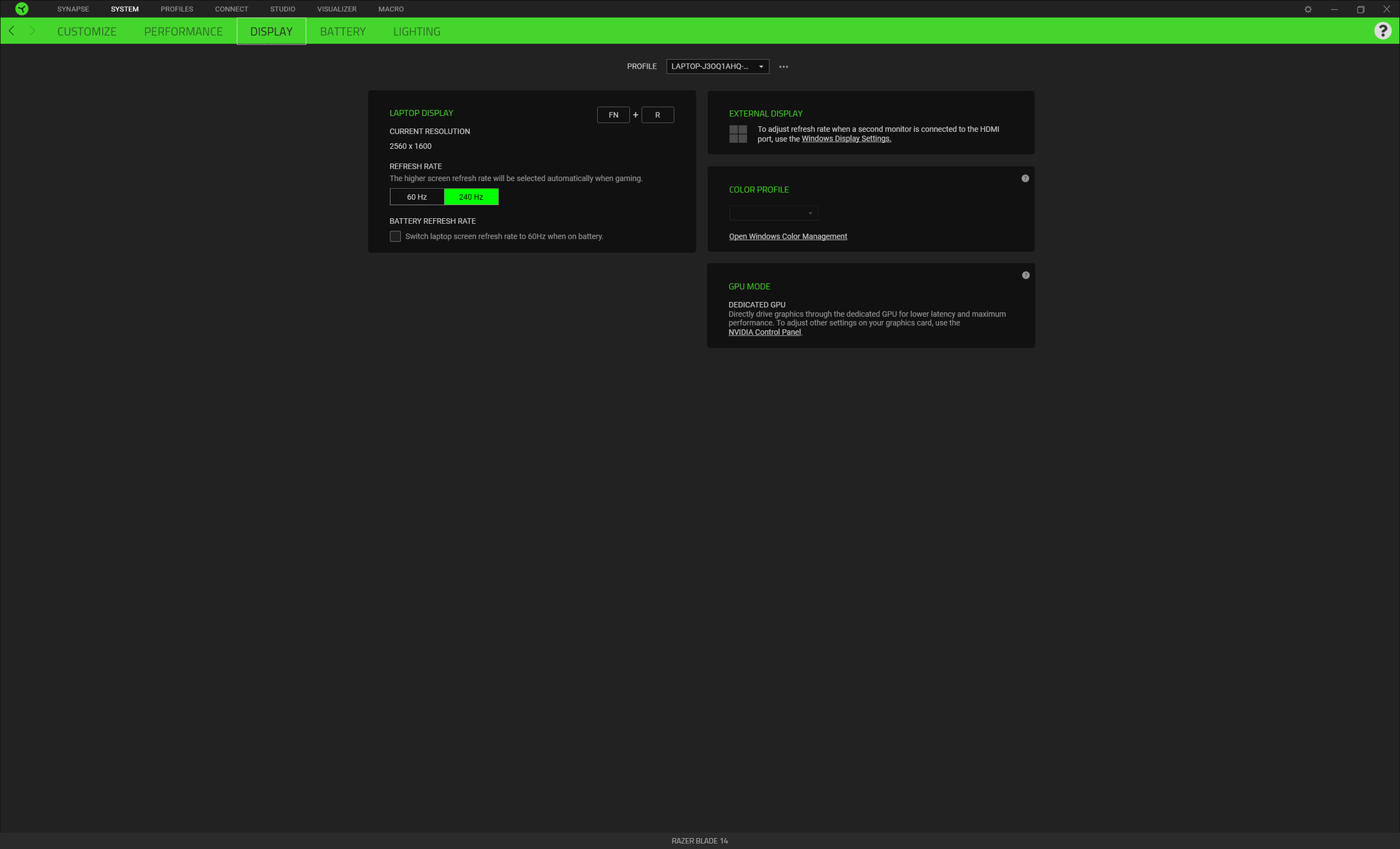 Nowy Blade 14 zachowuje prostotę dzięki panelowi IPS 16:10 od AU Optronics; gracze, którzy chcą mini-LED lub OLED, będą musieli spojrzeć na Zephyrus G14 lub Acer Predator Triton 300 SE zamiast tego. W porównaniu do panelu 16:9 z zeszłorocznego Blade 14, nowszy panel jest jaśniejszy, ma wyższą natywną częstotliwość odświeżania i wyższą natywną rozdzielczość przy zachowaniu podobnego czasu reakcji, poziomów czerni, odwzorowania kolorów i obsługi synchronizacji adaptacyjnej za pośrednictwem FreeSync Premium. Krótko mówiąc, nowszy panel opiera się na już doskonałym panelu bez żadnych cięć.