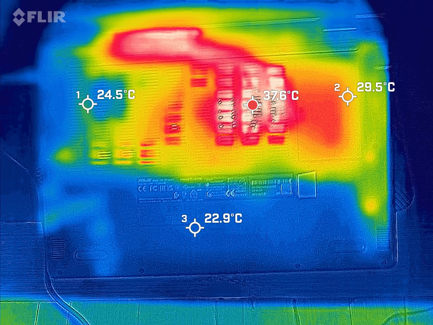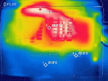Temperatury Asusa BR1402FG są niezmiennie bardzo dobre. W spoczynku zmierzyliśmy tylko 24 °C na górze i 22 °C na dole. Temperatury są również utrzymywane w granicach pod obciążeniem. W środku nad klawiaturą na górze znajduje się hotspot o temperaturze 41 °C. Średnio jednak górna strona ma średnio 28,4 °C, a na spodzie zmierzyliśmy średnio 28 °C.
