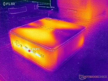 Hałas wentylatora jest zawsze obecny na urządzeniu bez względu na obciążenie ekranu, podobnie jak w przypadku NucBox K6. Zwykła praca na biegu jałowym na pulpicie wynosi już od 30 do 36 dB(A) na cichym tle 23 dB(A), nawet po ustawieniu trybu oszczędzania energii. Jednak hałas wentylatora podczas grania lub uruchamiania innych wymagających obciążeń wydaje się być cichszy w NucBox K9 na poziomie około 44 dB(A) w porównaniu do prawie 48 dB(A) w NucBox K6.