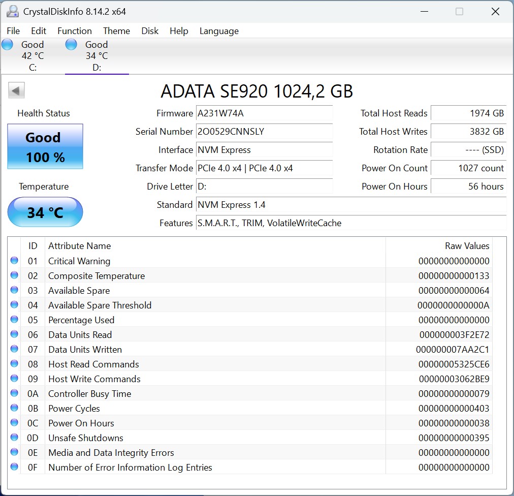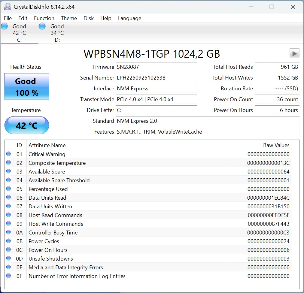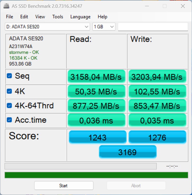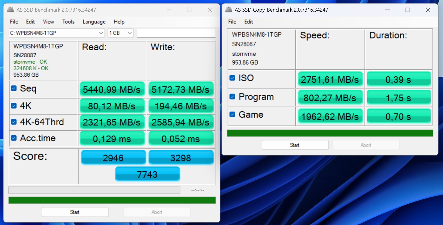 Geekom A7 Max wykorzystuje dysk SSD o pojemności 1 TB z połączeniem PCIe 4.0, który osiąga przyzwoite, jeśli nie wybitne, prędkości transferu. Do codziennych zadań i produktywnych obciążeń oferowana wydajność pamięci masowej jest jednak wystarczająca. Chłodzenie dysku zostało zaprojektowane w taki sposób, że wydajność pozostaje stabilna nawet przy długotrwałym obciążeniu.