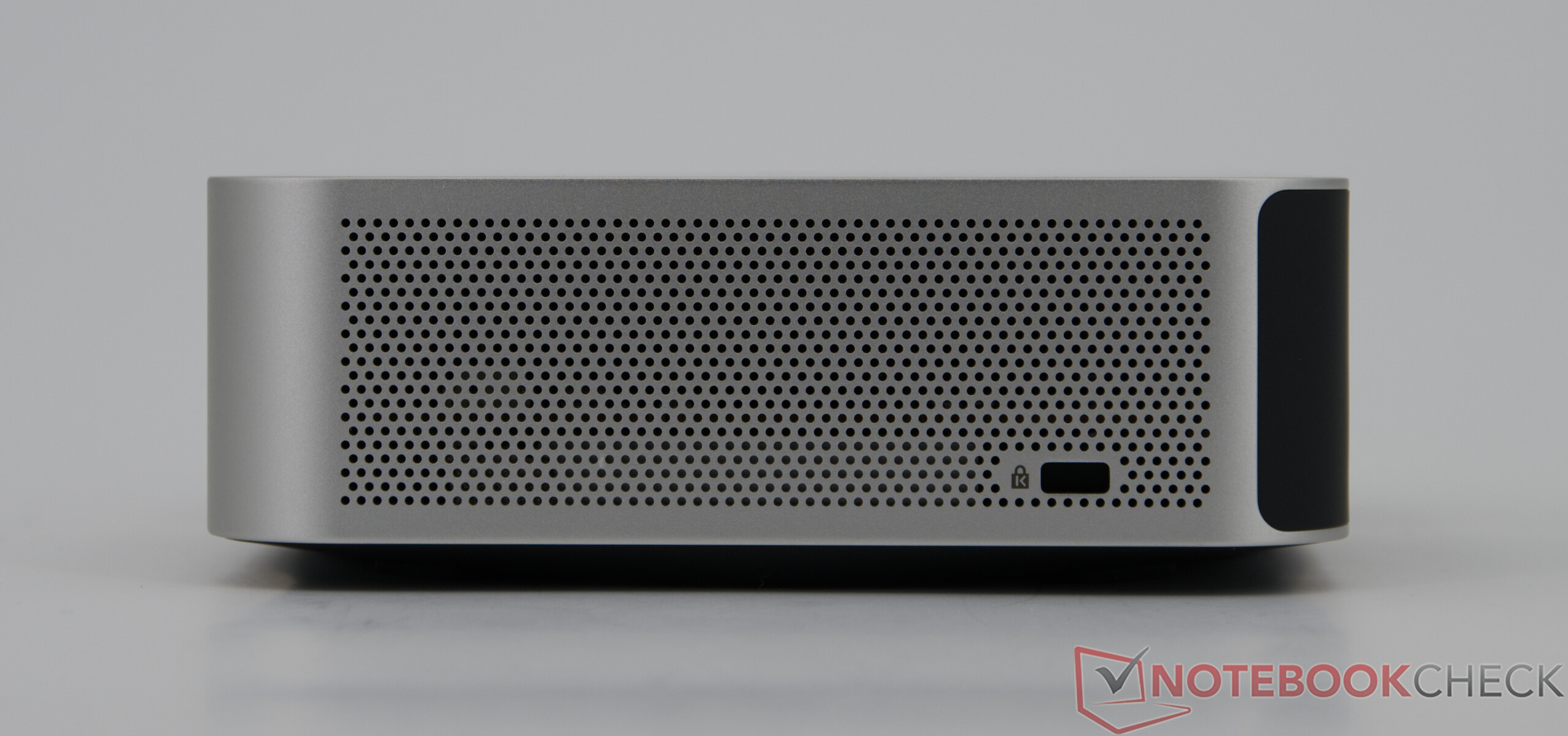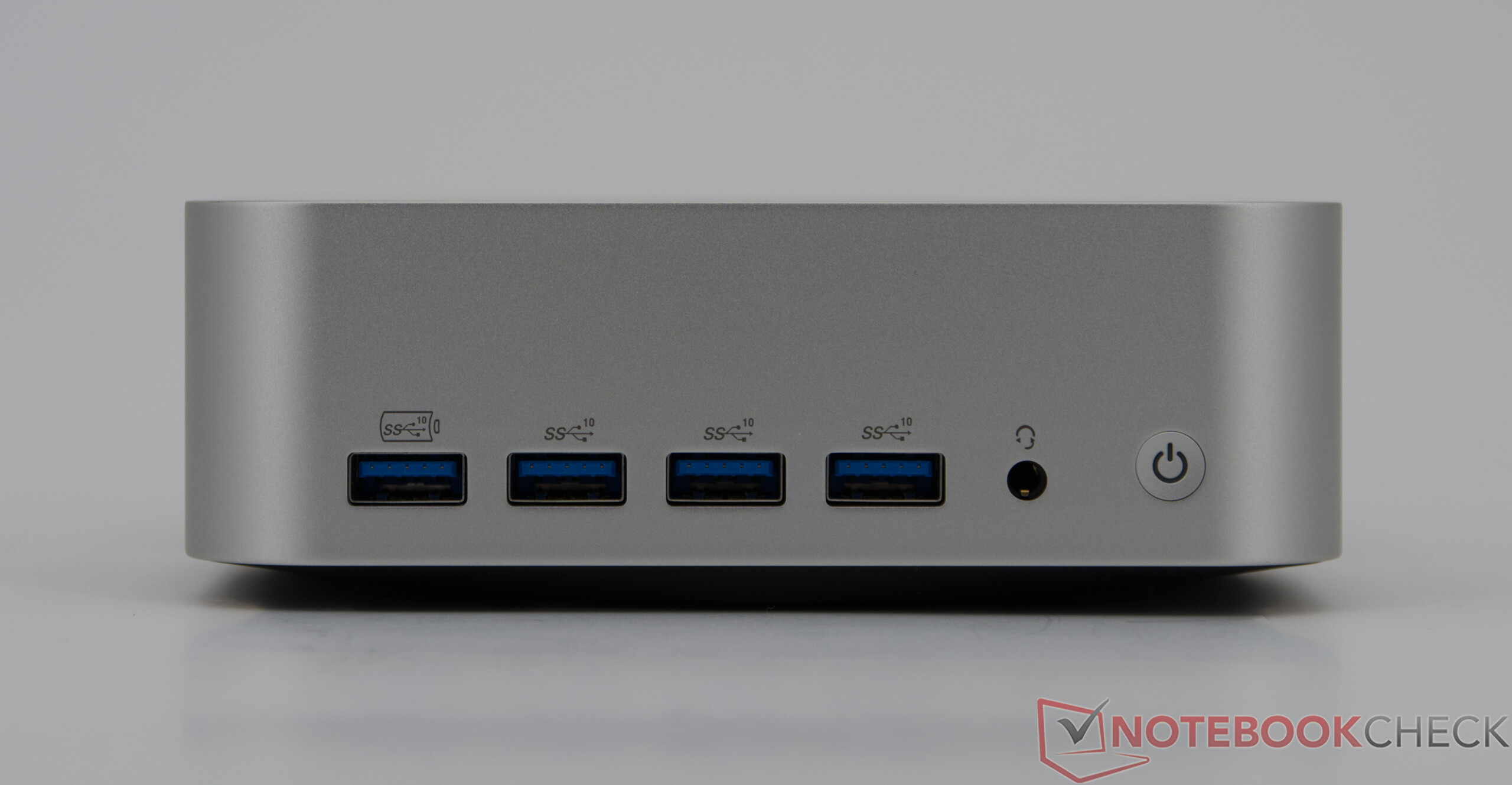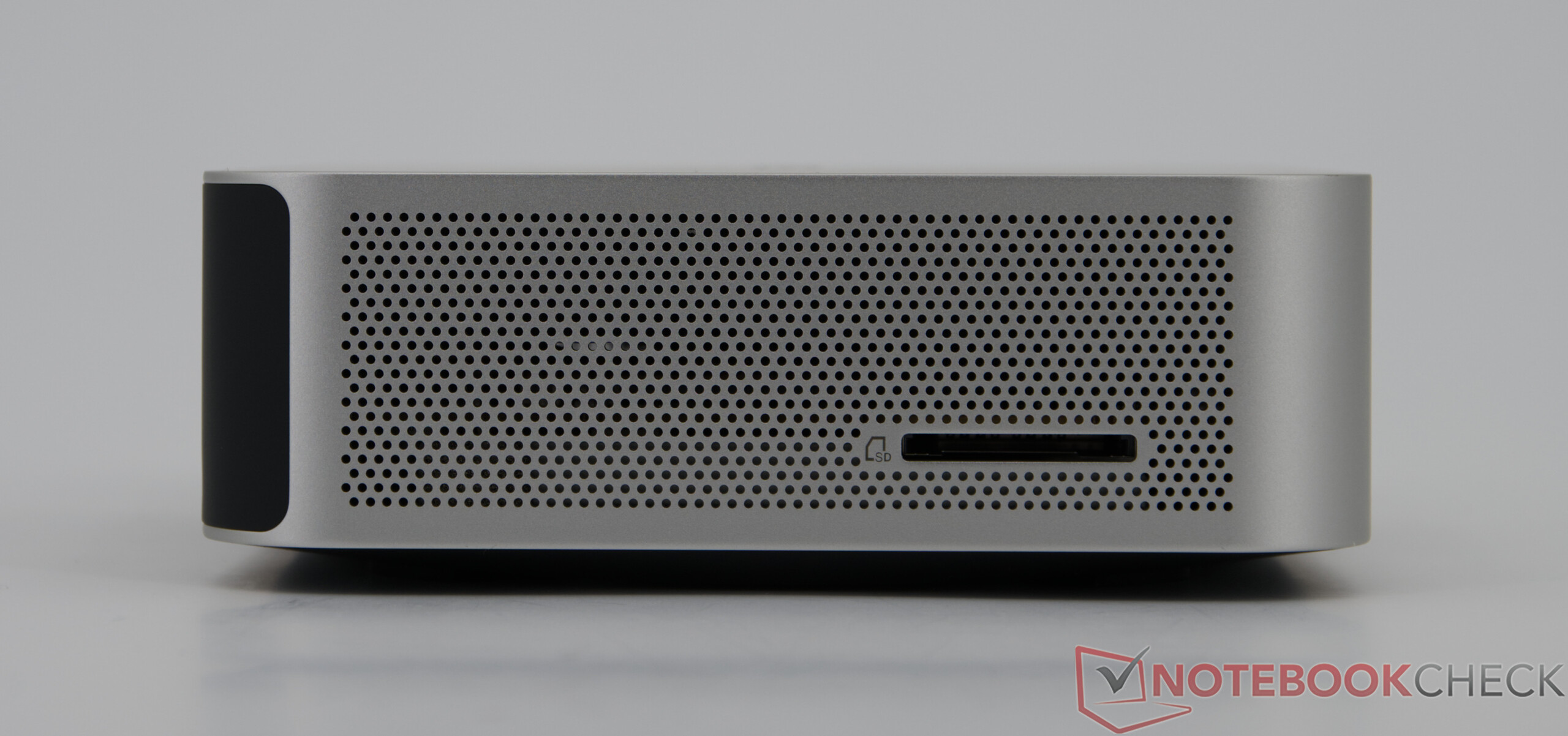 Obszerna obudowa pozwala na szeroki zakres połączeń: w sumie dostępnych jest sześć portów USB-A, z których cztery znajdują się z przodu, uzupełnione dwoma portami USB4 z tyłu i dwoma wyjściami HDMI. Pozwala to na jednoczesną obsługę do czterech monitorów. Szybki czytnik kart SD z boku uzupełnia wyposażenie, podczas gdy USB4 umożliwia wysoką szybkość transmisji danych, co imponująco pokazują zewnętrzne dyski SSD.