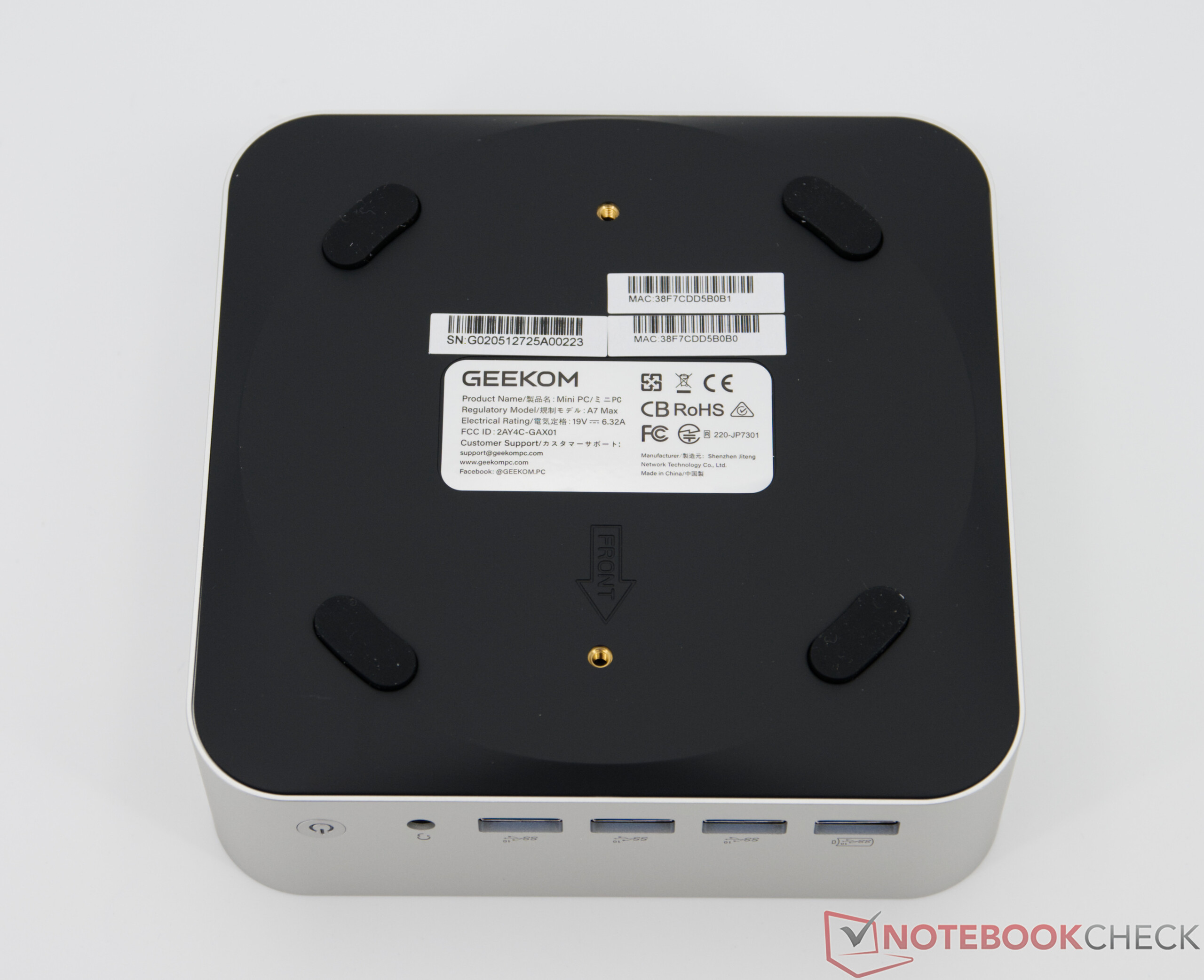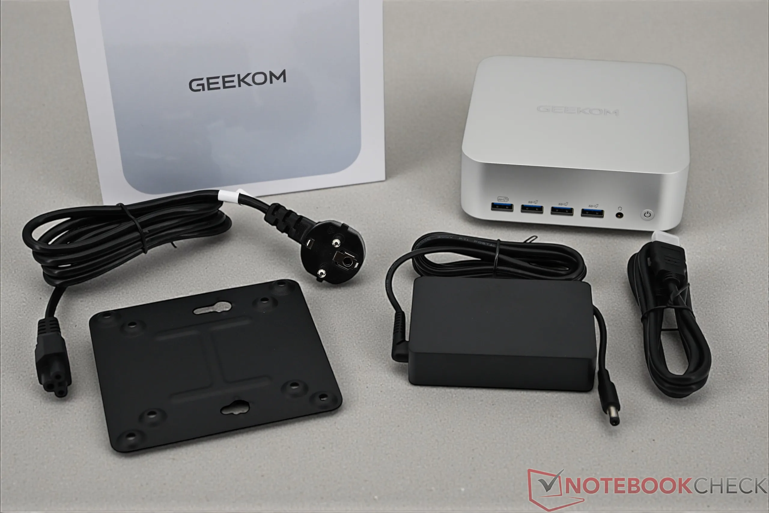 Geekom A7 Max wykorzystuje tę samą, większą obudowę co A8 Max czy A9 Max, wyraźnie odróżniając się od wcześniejszych modeli. Niemniej jednak Geekom zdecydował się na często stosowaną aluminiową obudowę, co oznacza, że wszystkie zalety i wady pozostają takie same. Wykonanie jest wysokiej jakości i odpowiada przedziałowi cenowemu. Przy wadze około 681 gramów, Mini-PC pozostaje lżejszy niż niektóre konkurencyjne modele pomimo swoich rozmiarów, a kompaktowy 256-gramowy zasilacz jest ledwo zauważalny.