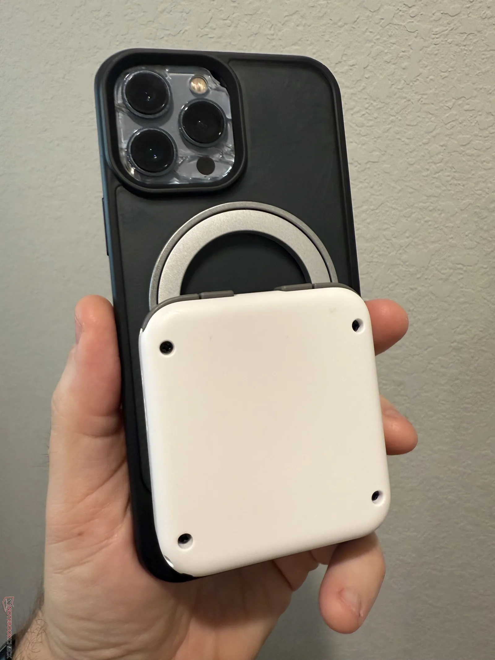 Magnes jest oddzielnym elementem od kontrolera, który mocuje się do magnesu i wyrównuje za pomocą małego kołka na górze. Jednak ten kołek nie jest tak stabilny, jak można by się spodziewać, szczególnie w przypadku większych lub cięższych telefonów. W moich testach iPhone 13 czuł się dość dobrze zabezpieczony, ale iPhone 13 Pro Max i iPhone 16 Pro Max czuły się chwiejnie i nie były pewnie zabezpieczone. To powiedziawszy, telefony pozostały na miejscu, chyba że zostały celowo potrząśnięte, w którym to przypadku pierścień magnetyczny odłączył się od kontrolera.